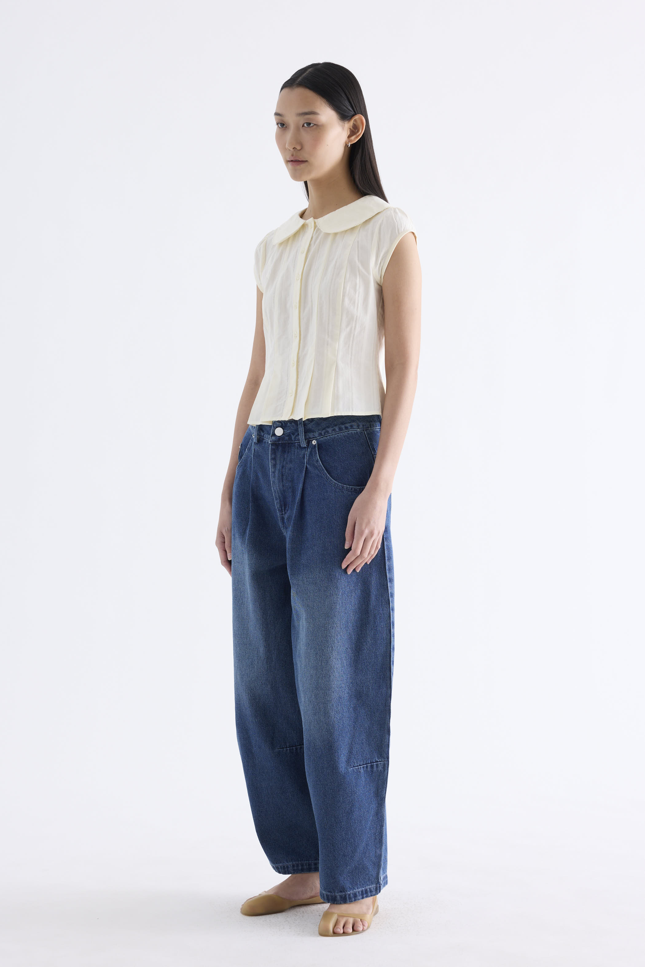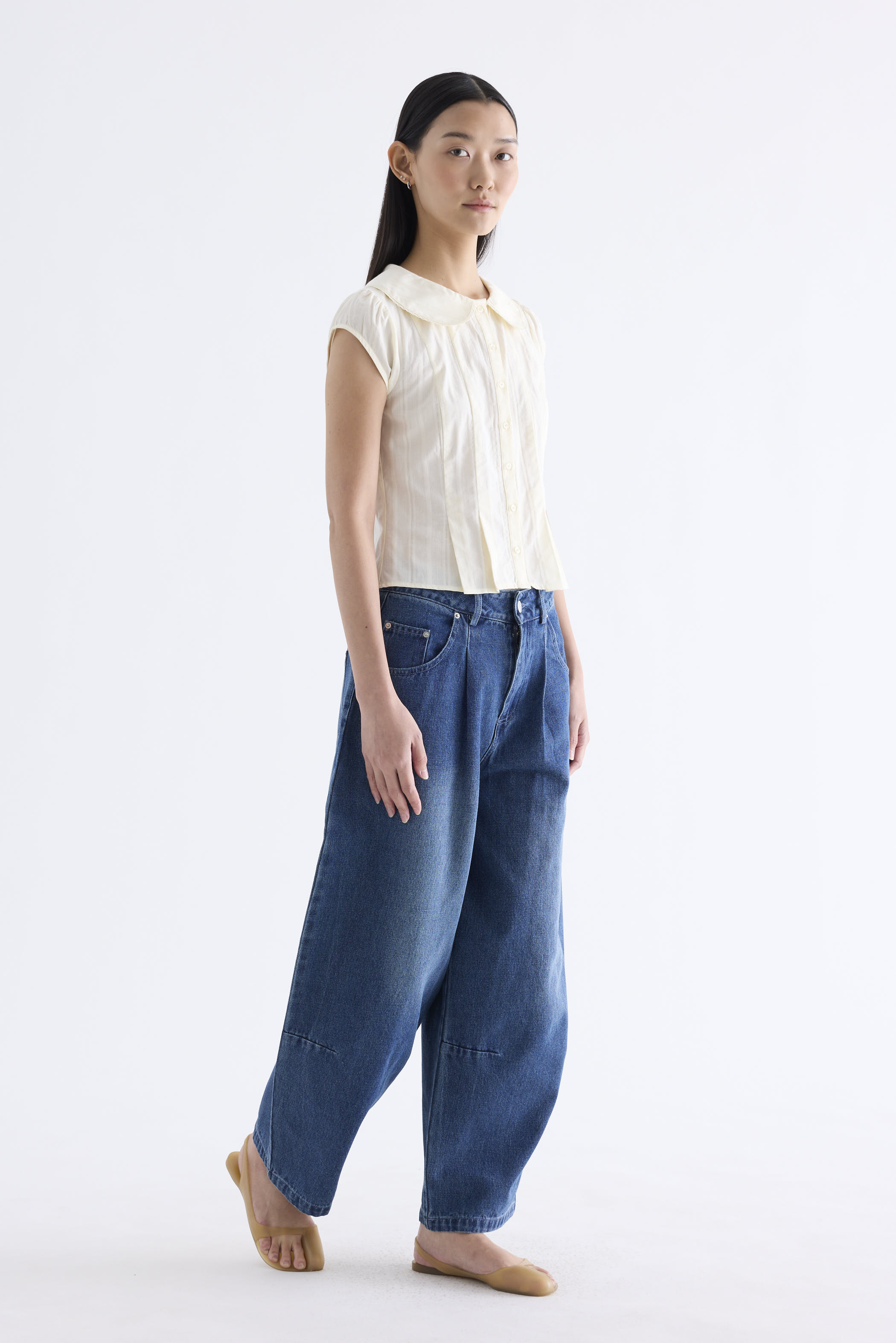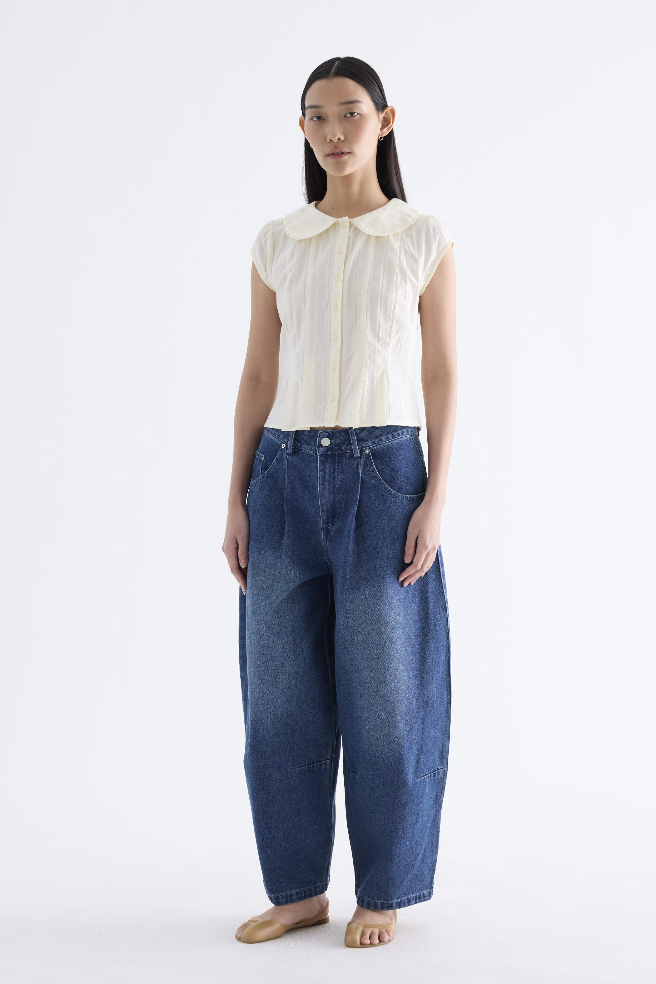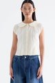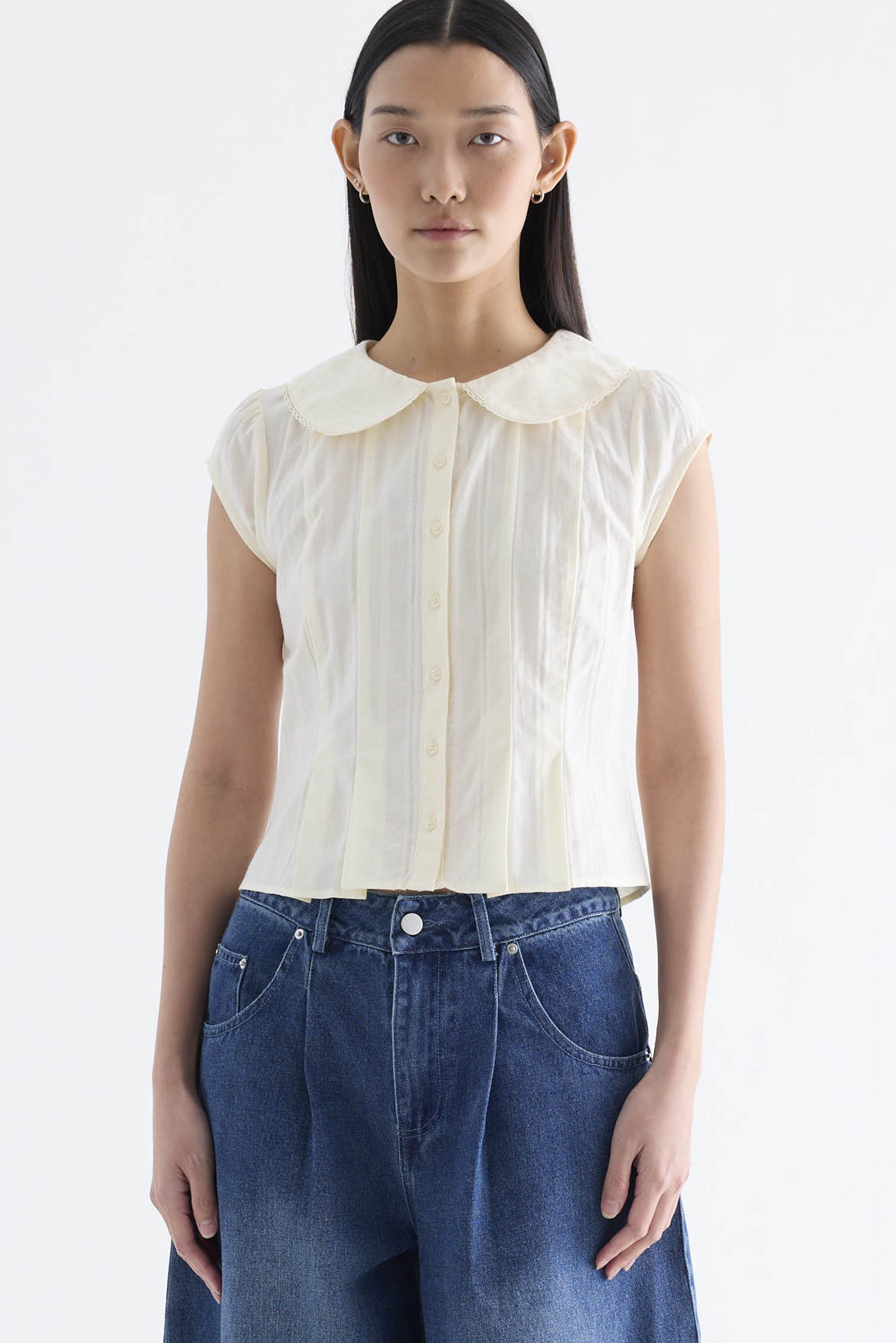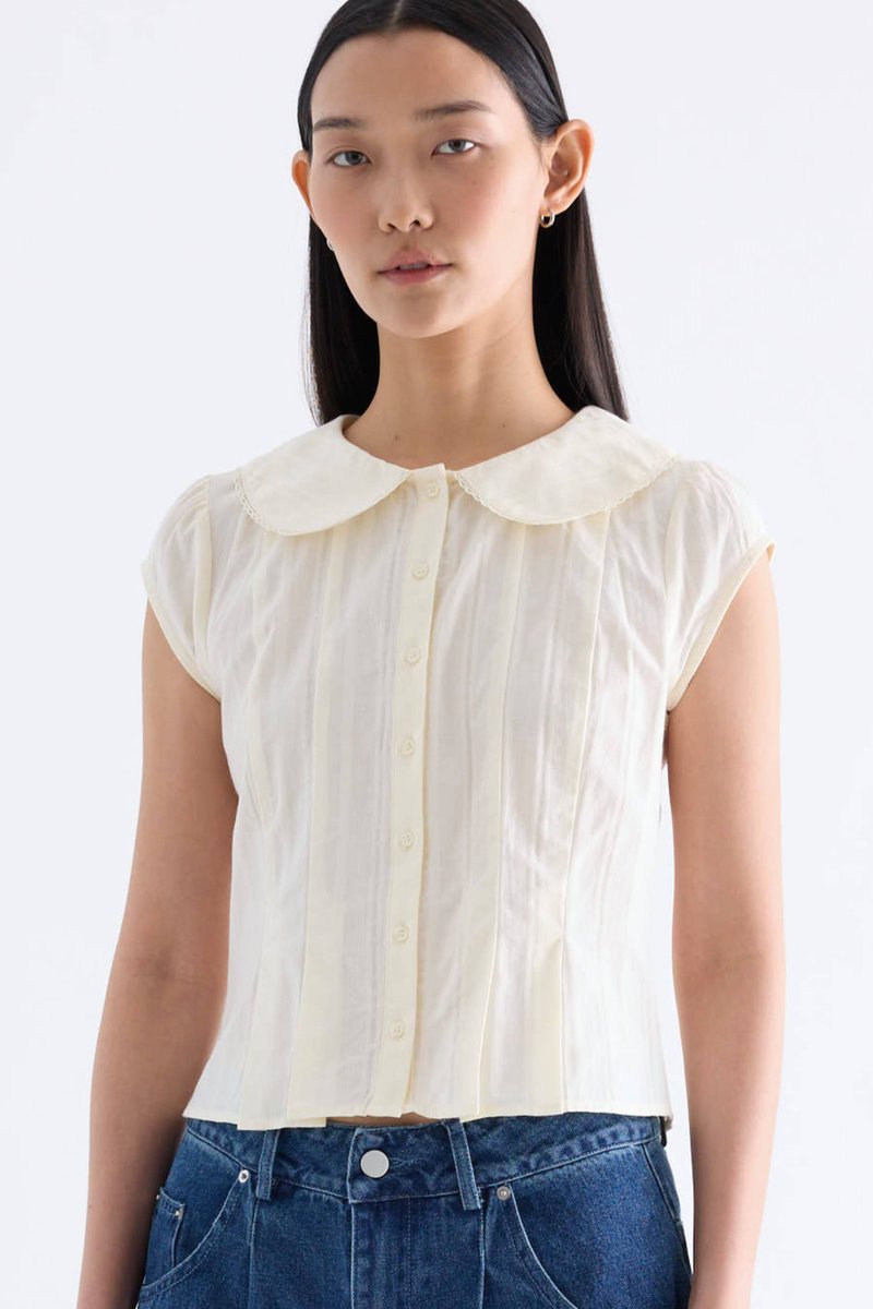 Details first. Cut from airy and striped cotton, this top features lace-trimmed Peter Pan collars, gathered cap sleeves, a pleated hem and a button-down front. Worn in a slim fit.