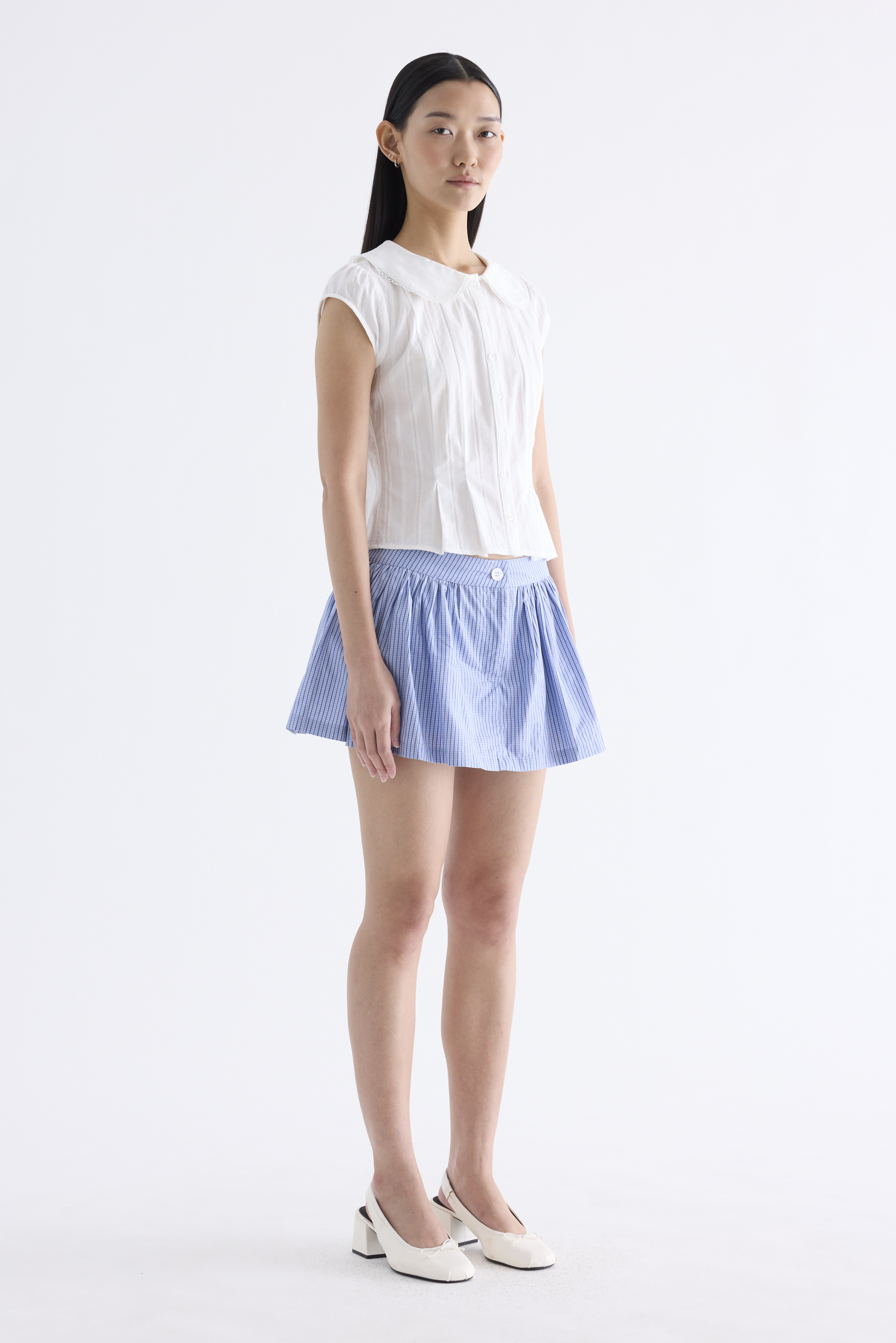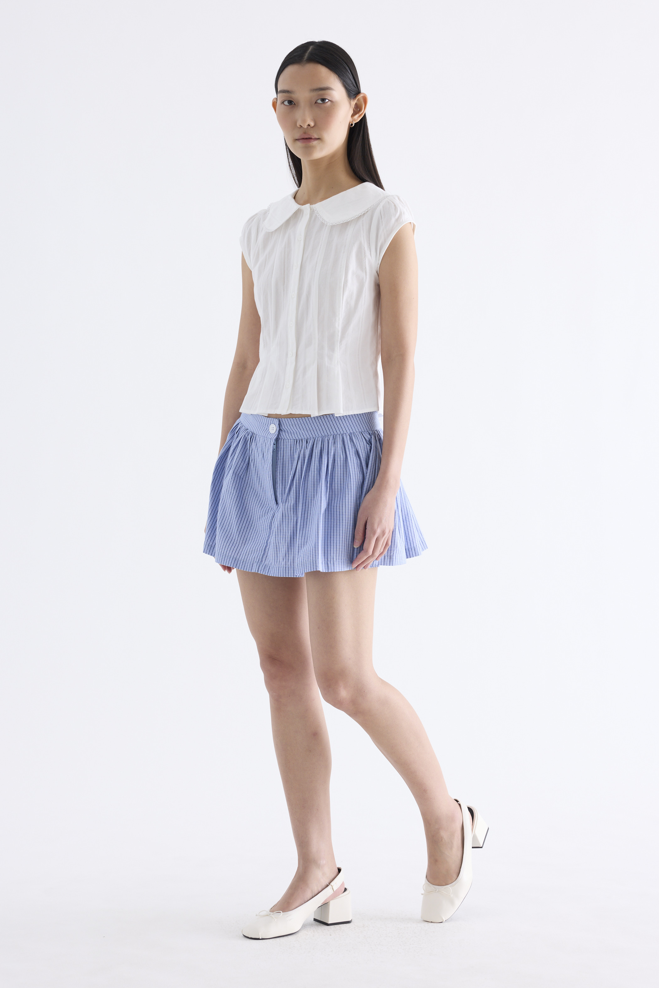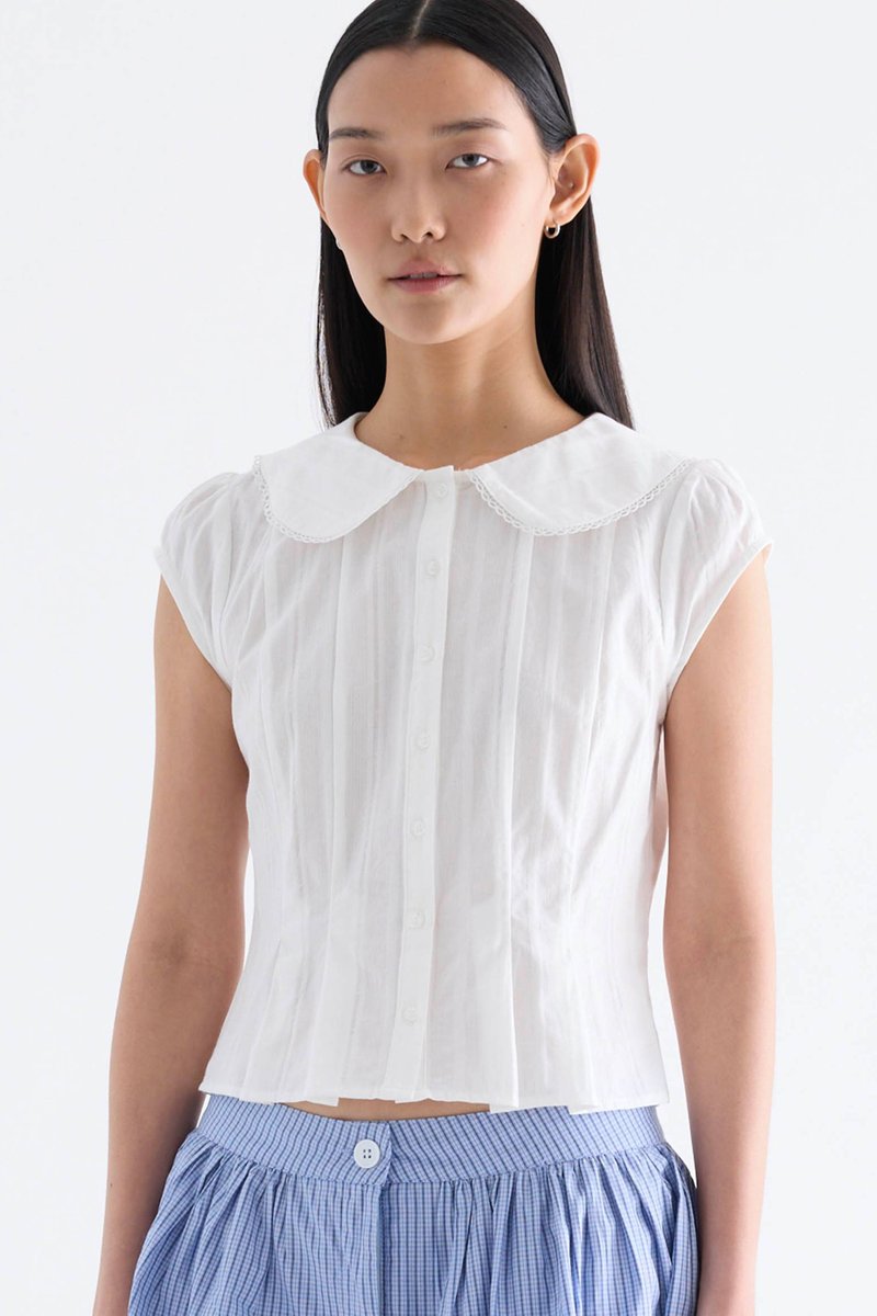 Details first. Cut from airy and striped cotton, this top features lace-trimmed Peter Pan collars, gathered cap sleeves, a pleated hem and a button-down front. Worn in a slim fit.