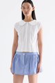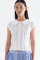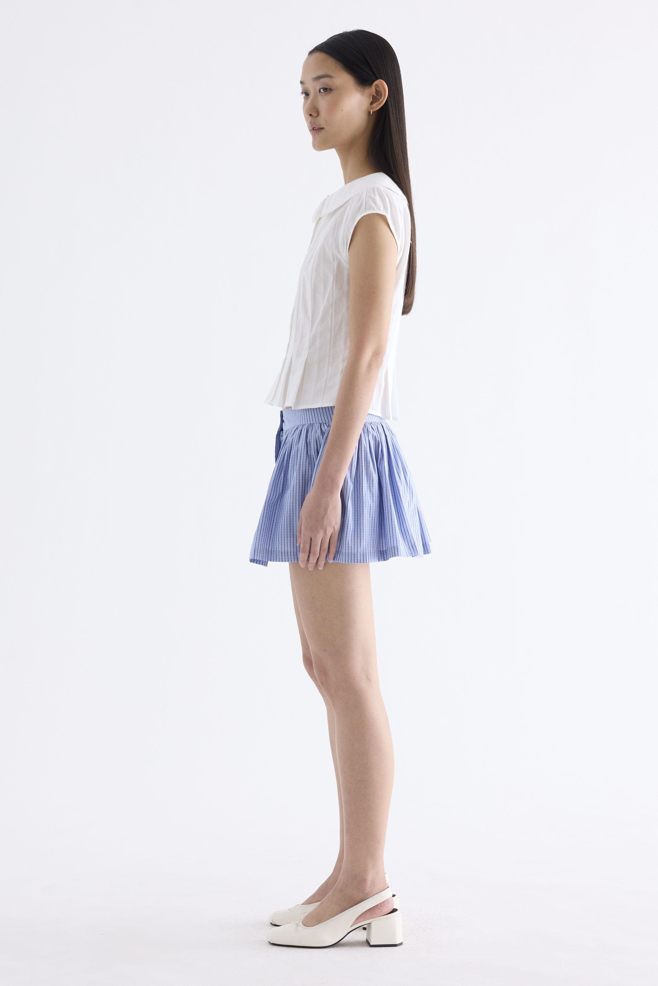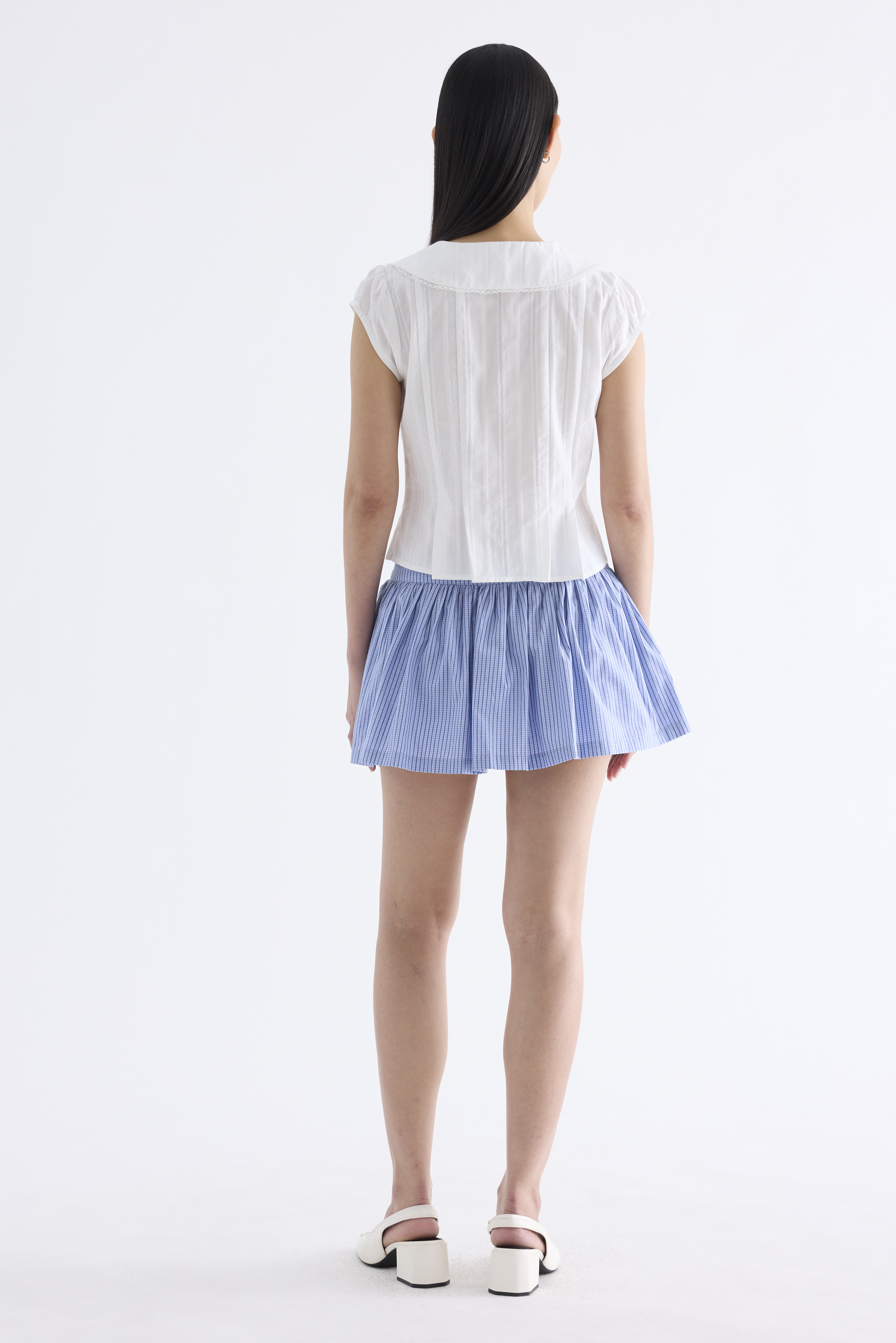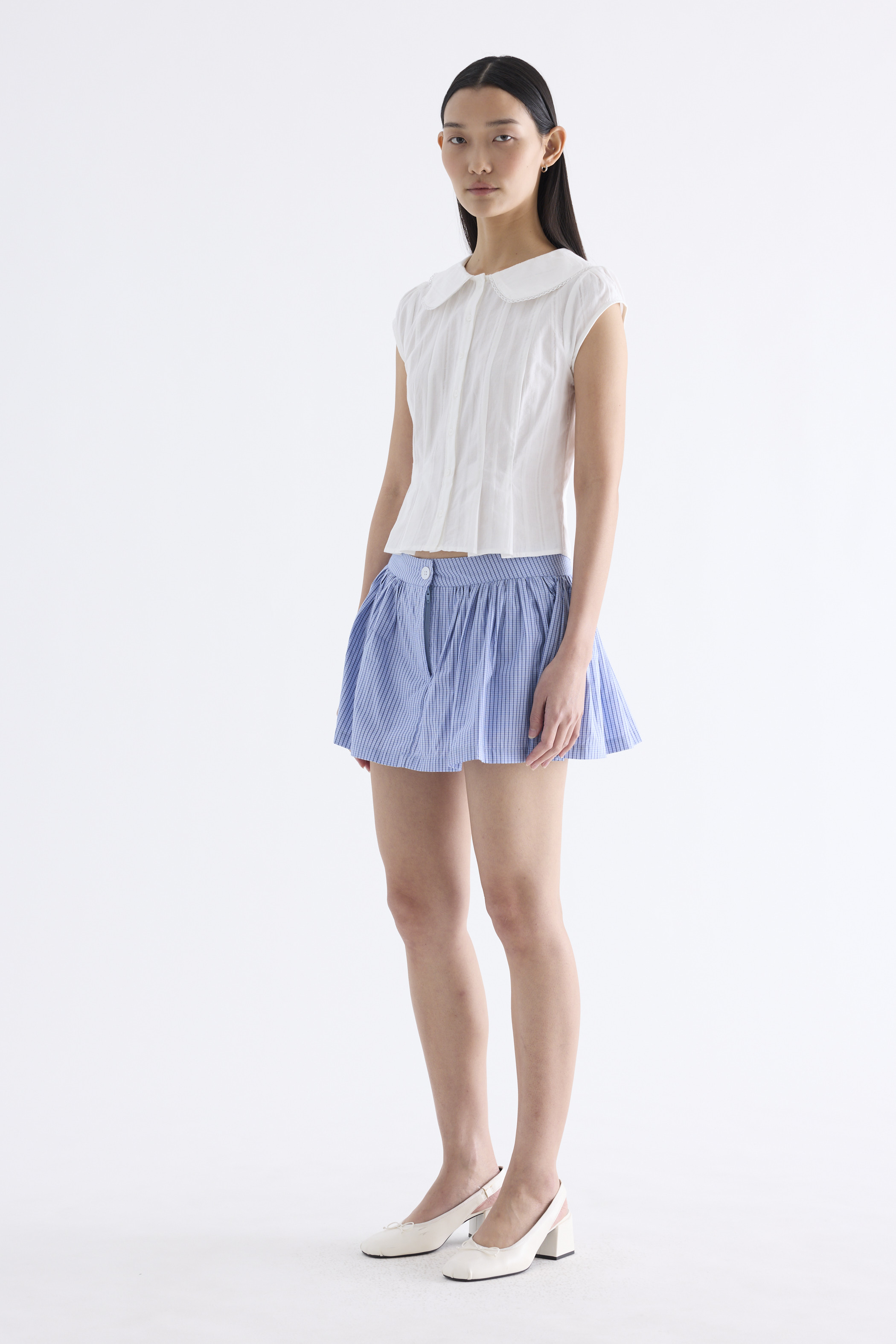 Details first. Cut from airy and striped cotton, this top features lace-trimmed Peter Pan collars, gathered cap sleeves, a pleated hem and a button-down front. Worn in a slim fit.