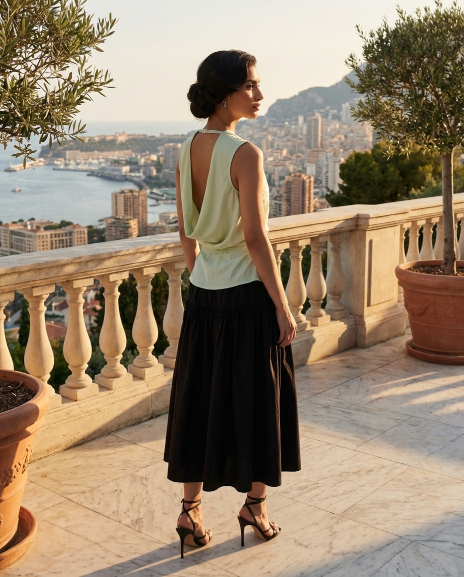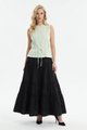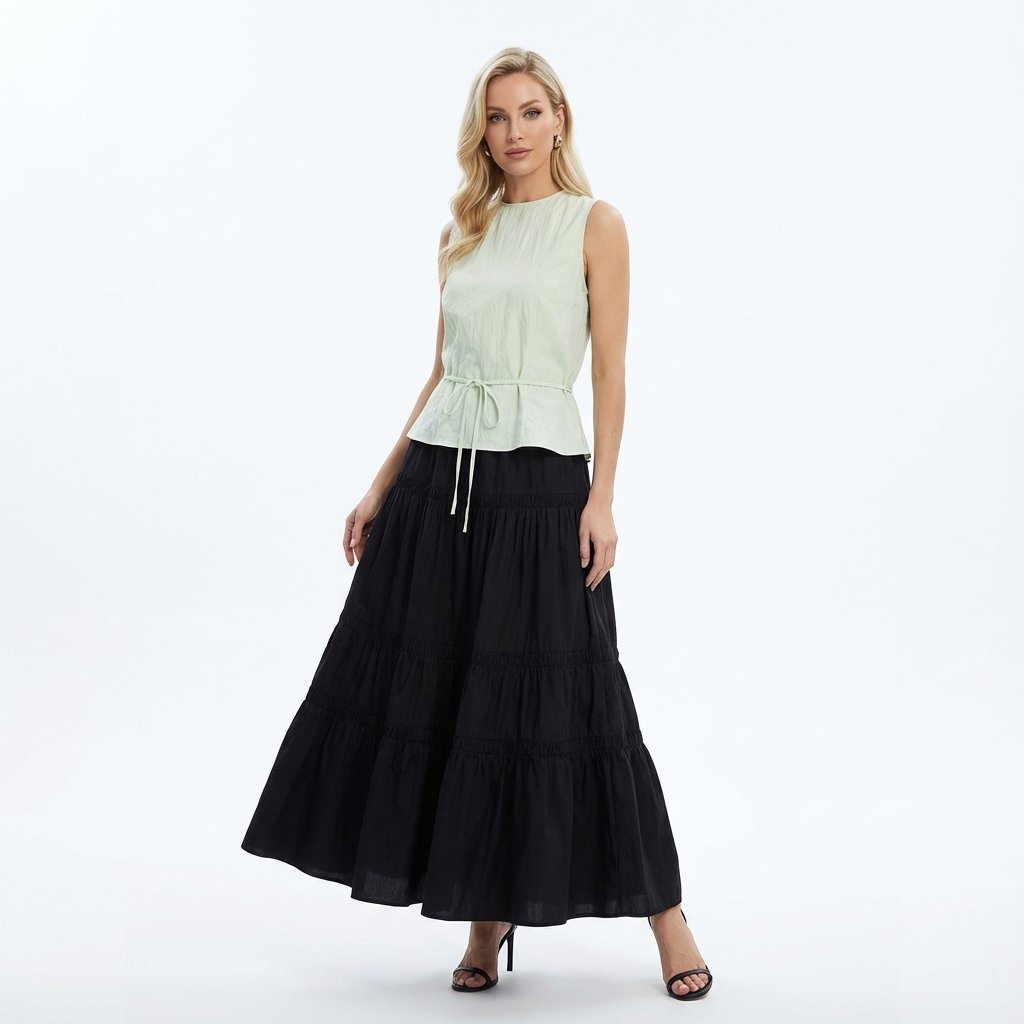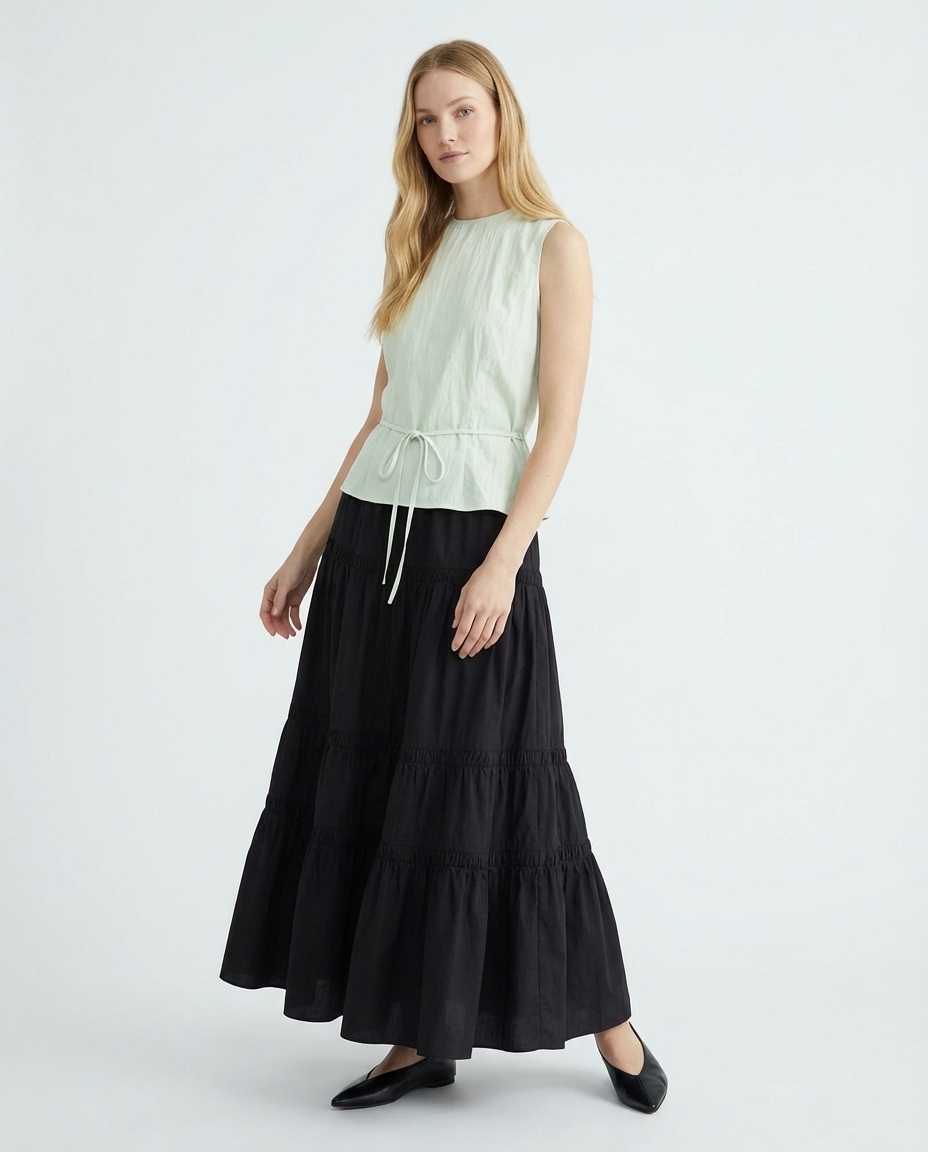 One top, two sides. Made from smooth and airy fabric, this sleeveless top features a round neckline, waist tie-strap, as well as a drapey back opening with a connecting strap. Worn in a relaxed silhouette.