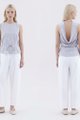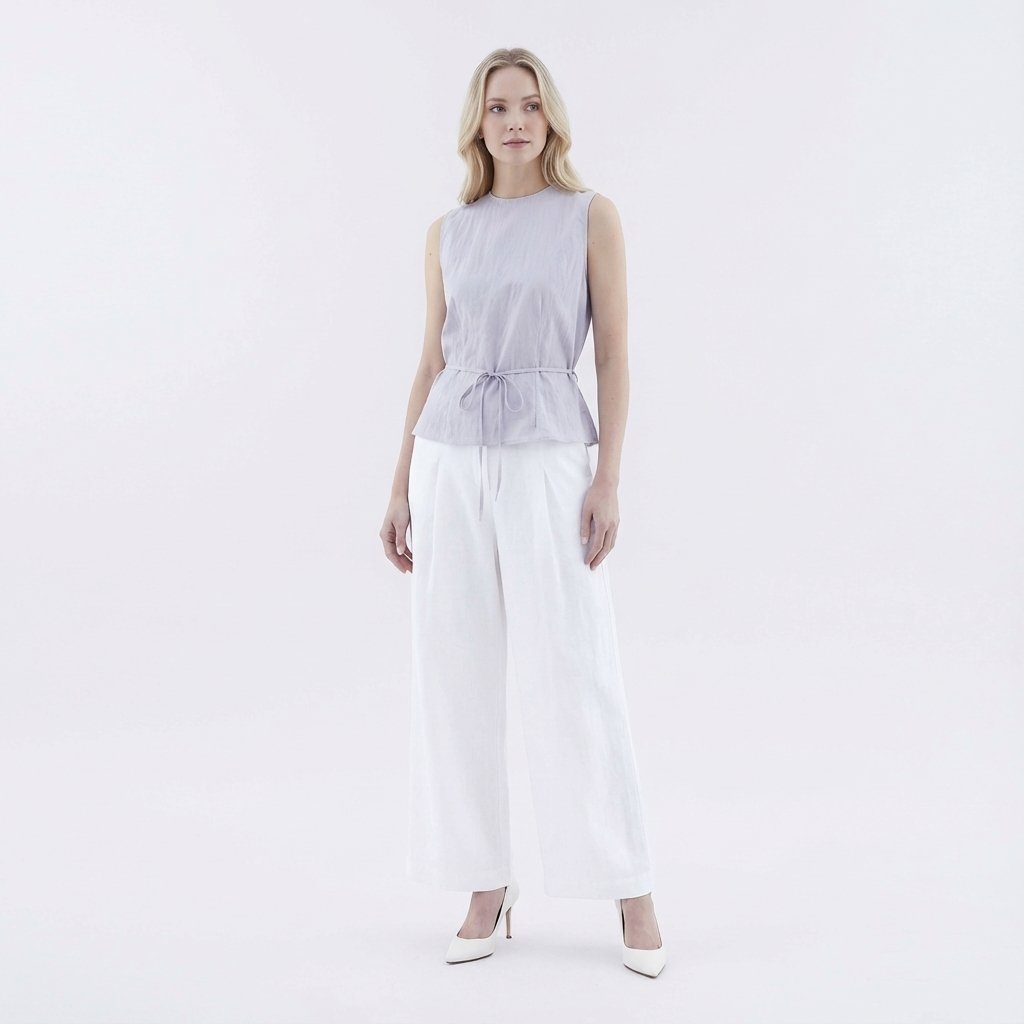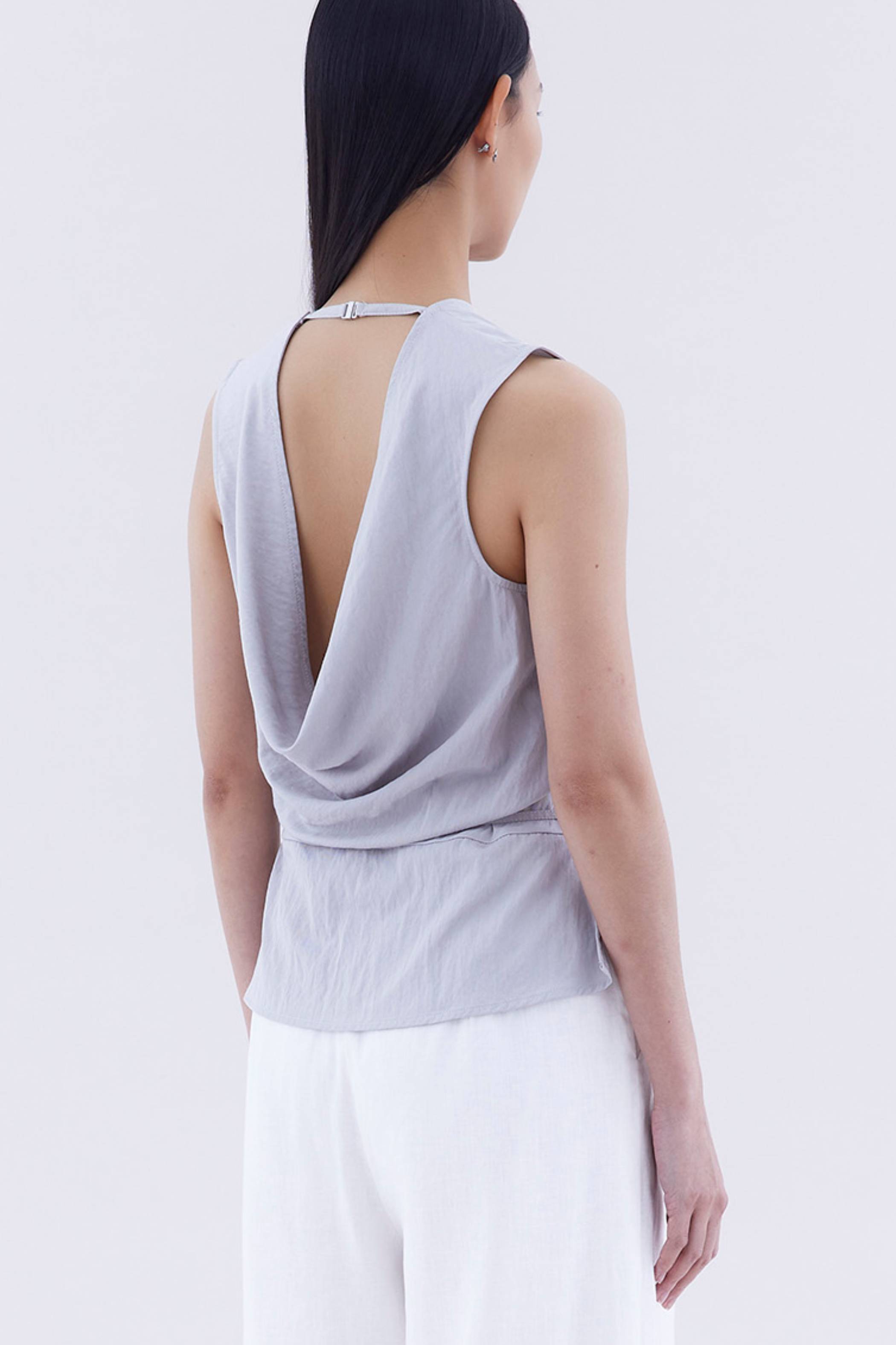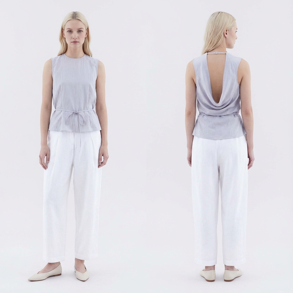 One top, two sides. Made from smooth and airy fabric, this sleeveless top features a round neckline, waist tie-strap, as well as a drapey back opening with a connecting strap. Worn in a relaxed silhouette.