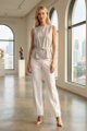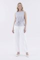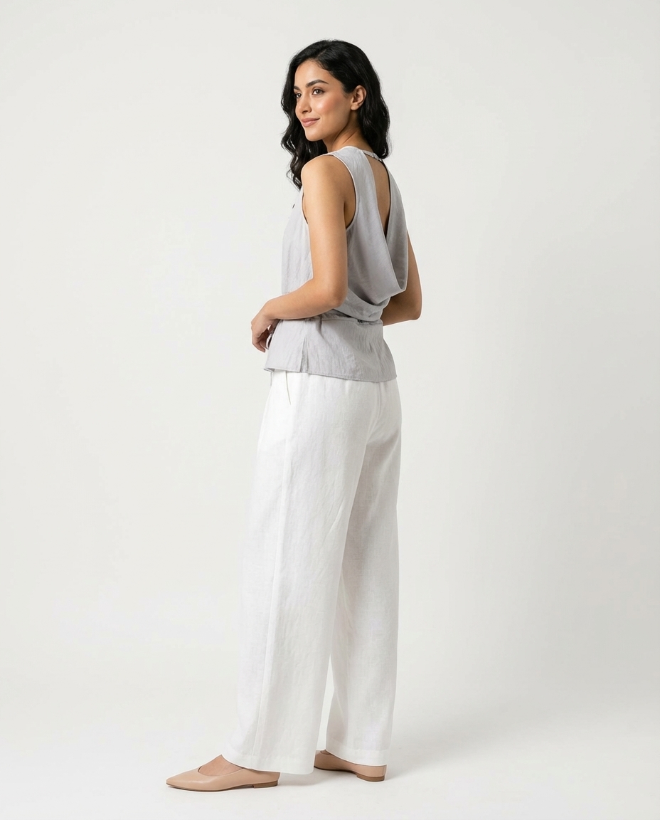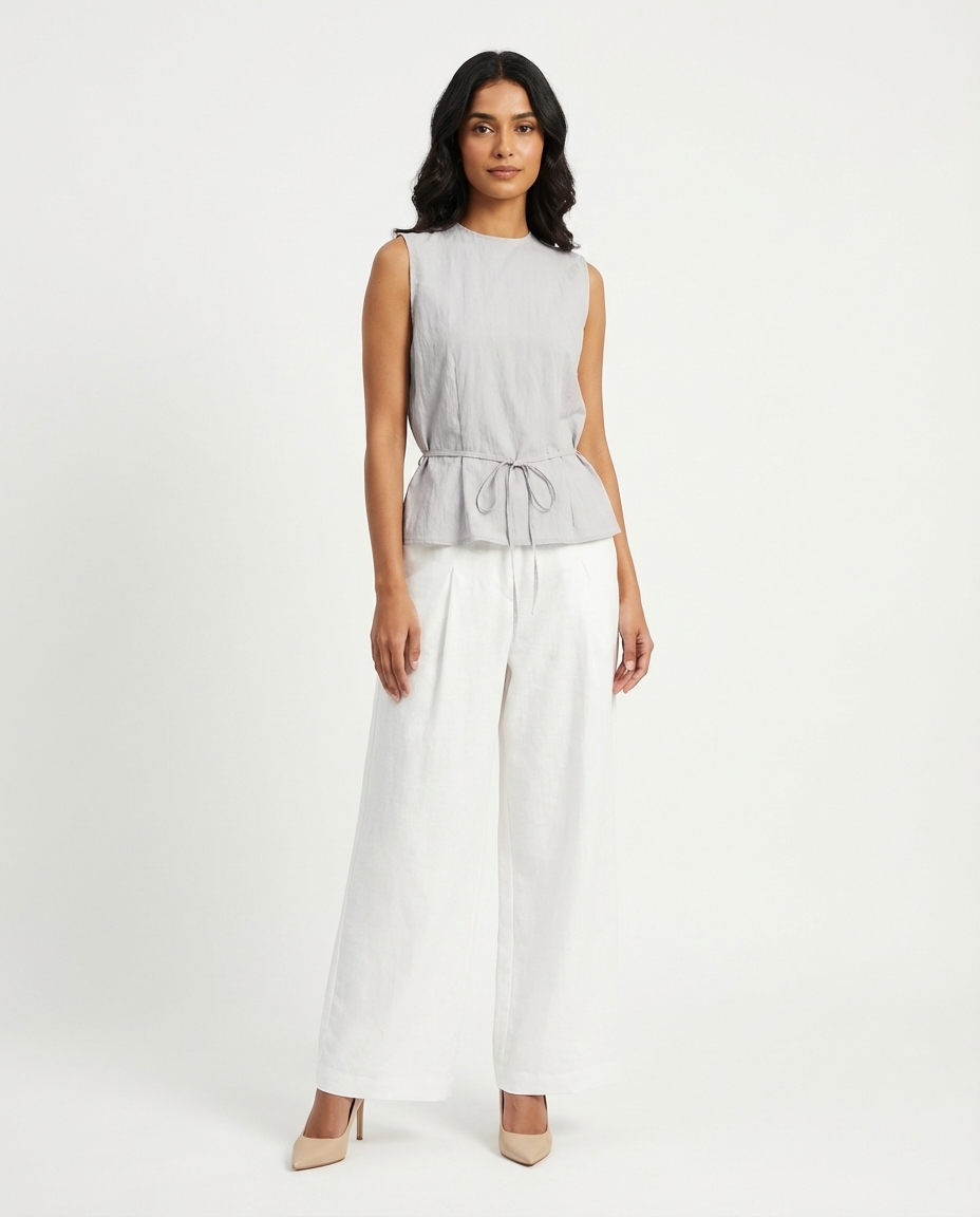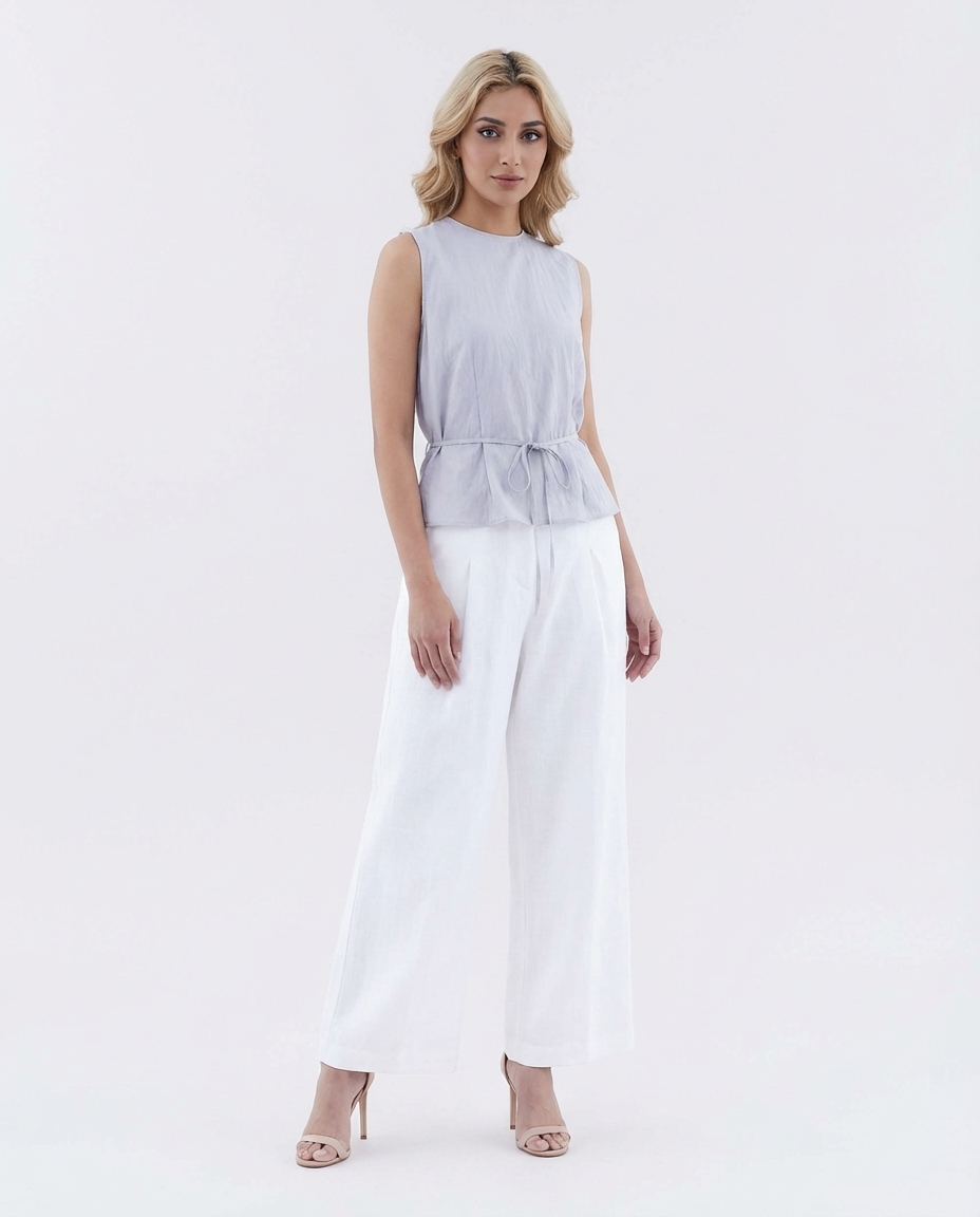 One top, two sides. Made from smooth and airy fabric, this sleeveless top features a round neckline, waist tie-strap, as well as a drapey back opening with a connecting strap. Worn in a relaxed silhouette.
