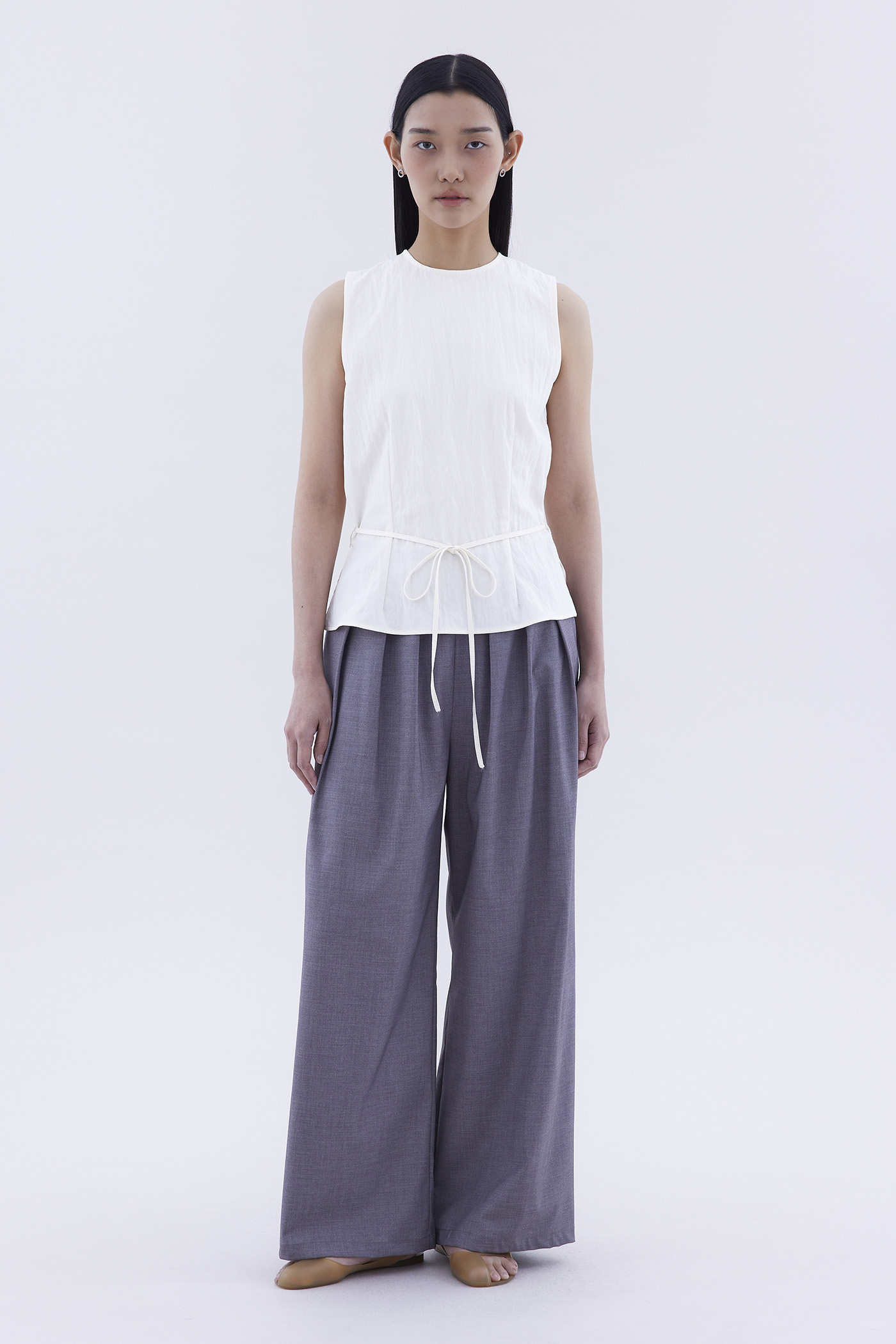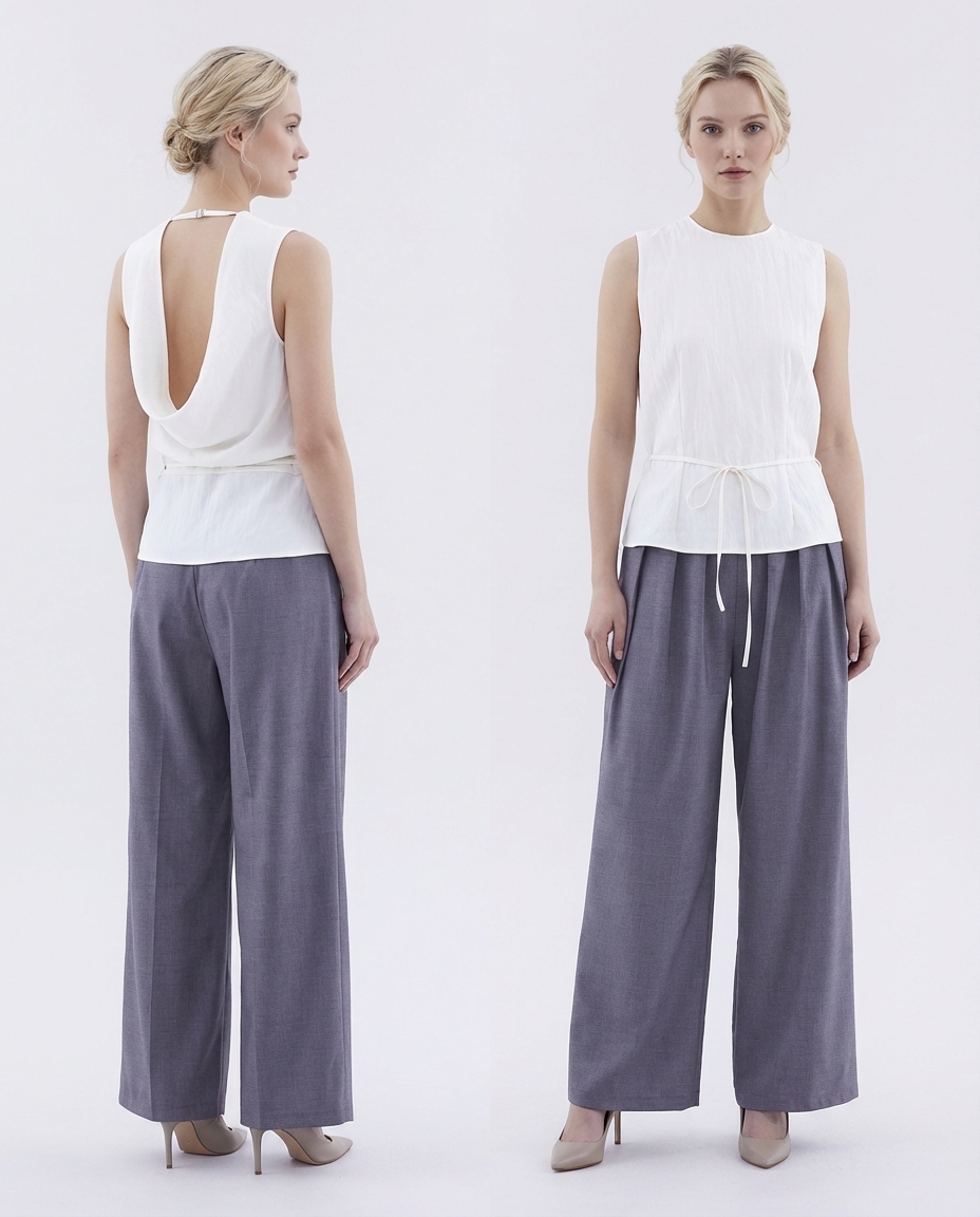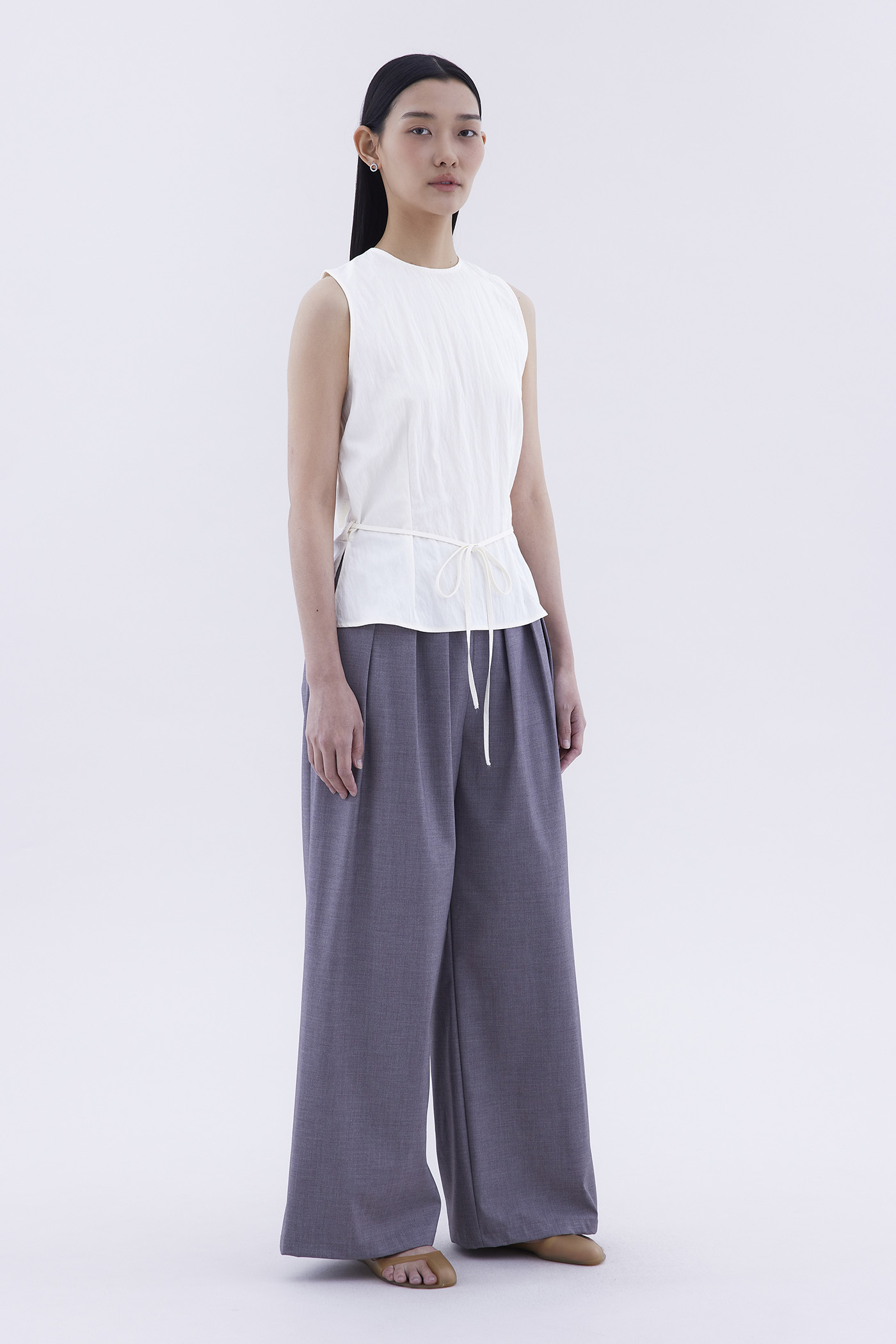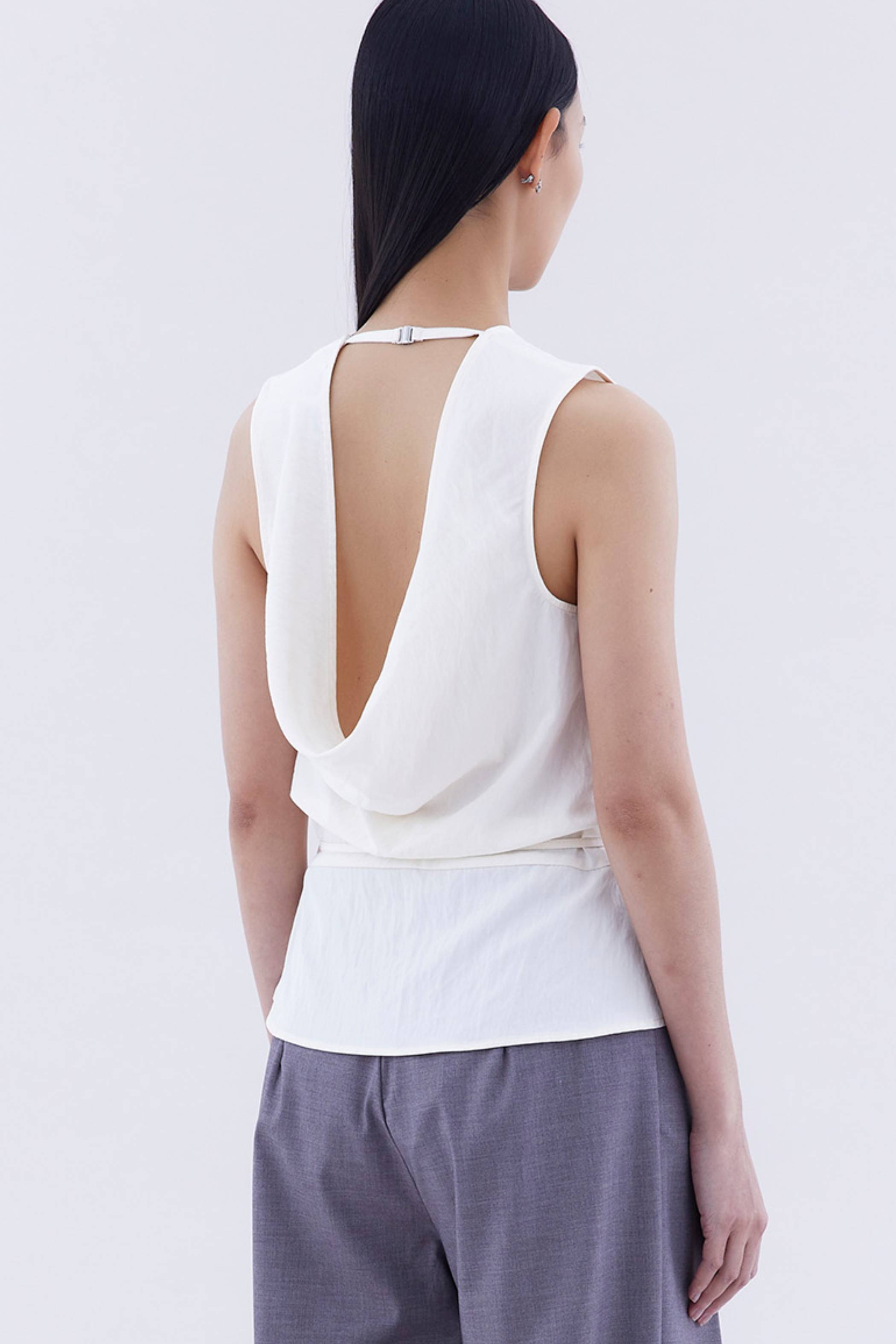 One top, two sides. Made from smooth and airy fabric, this sleeveless top features a round neckline, waist tie-strap, as well as a drapey back opening with a connecting strap. Worn in a relaxed silhouette.