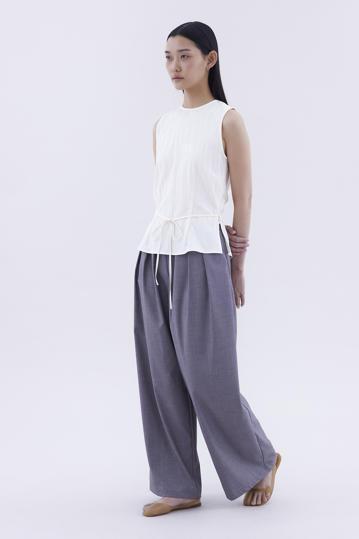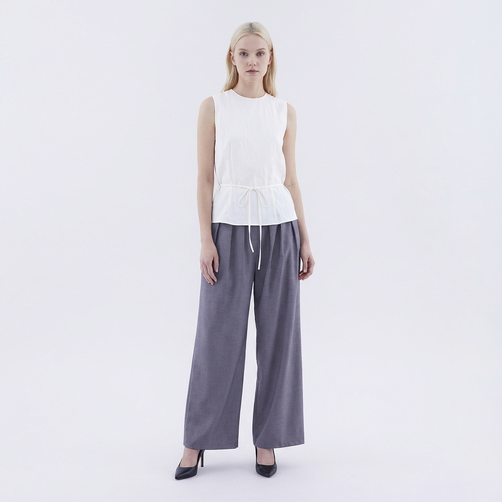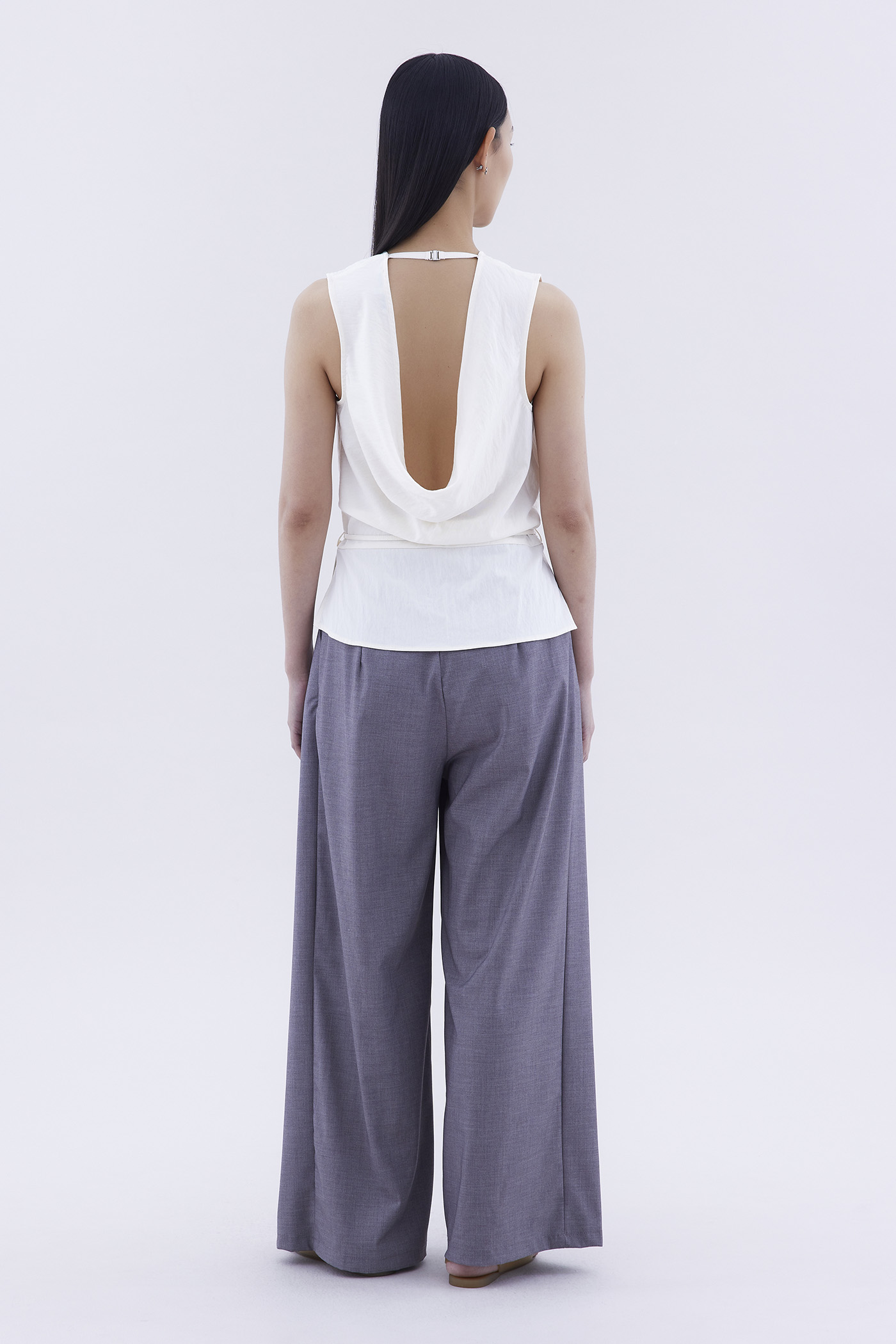 One top, two sides. Made from smooth and airy fabric, this sleeveless top features a round neckline, waist tie-strap, as well as a drapey back opening with a connecting strap. Worn in a relaxed silhouette.