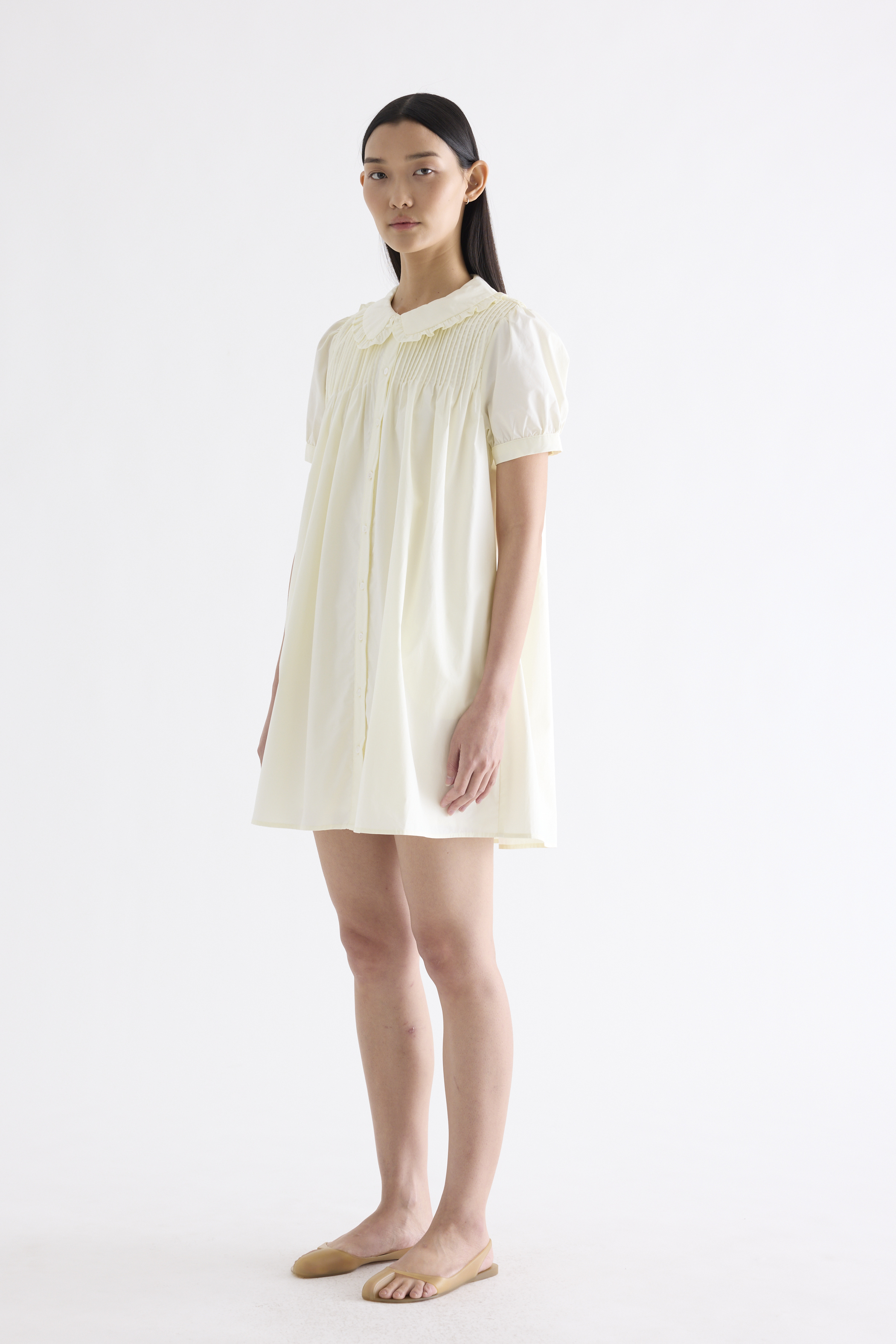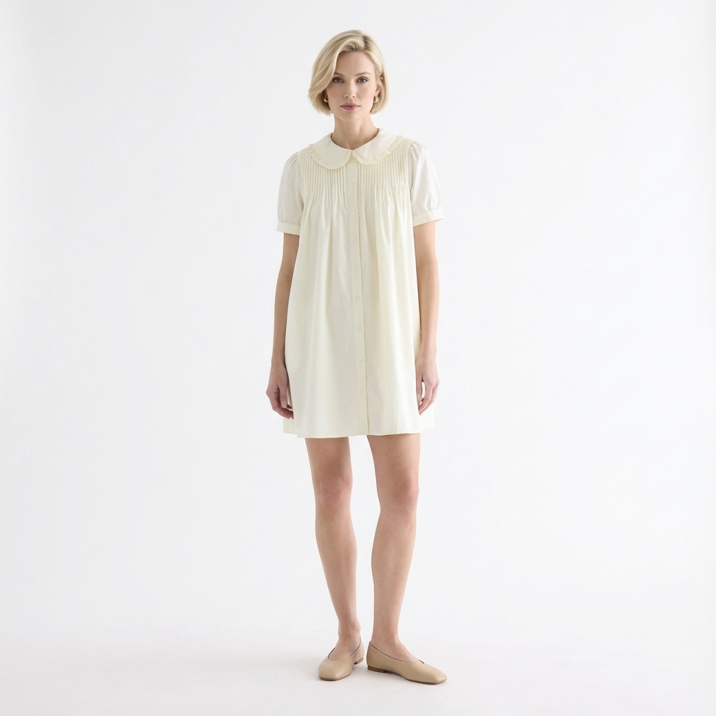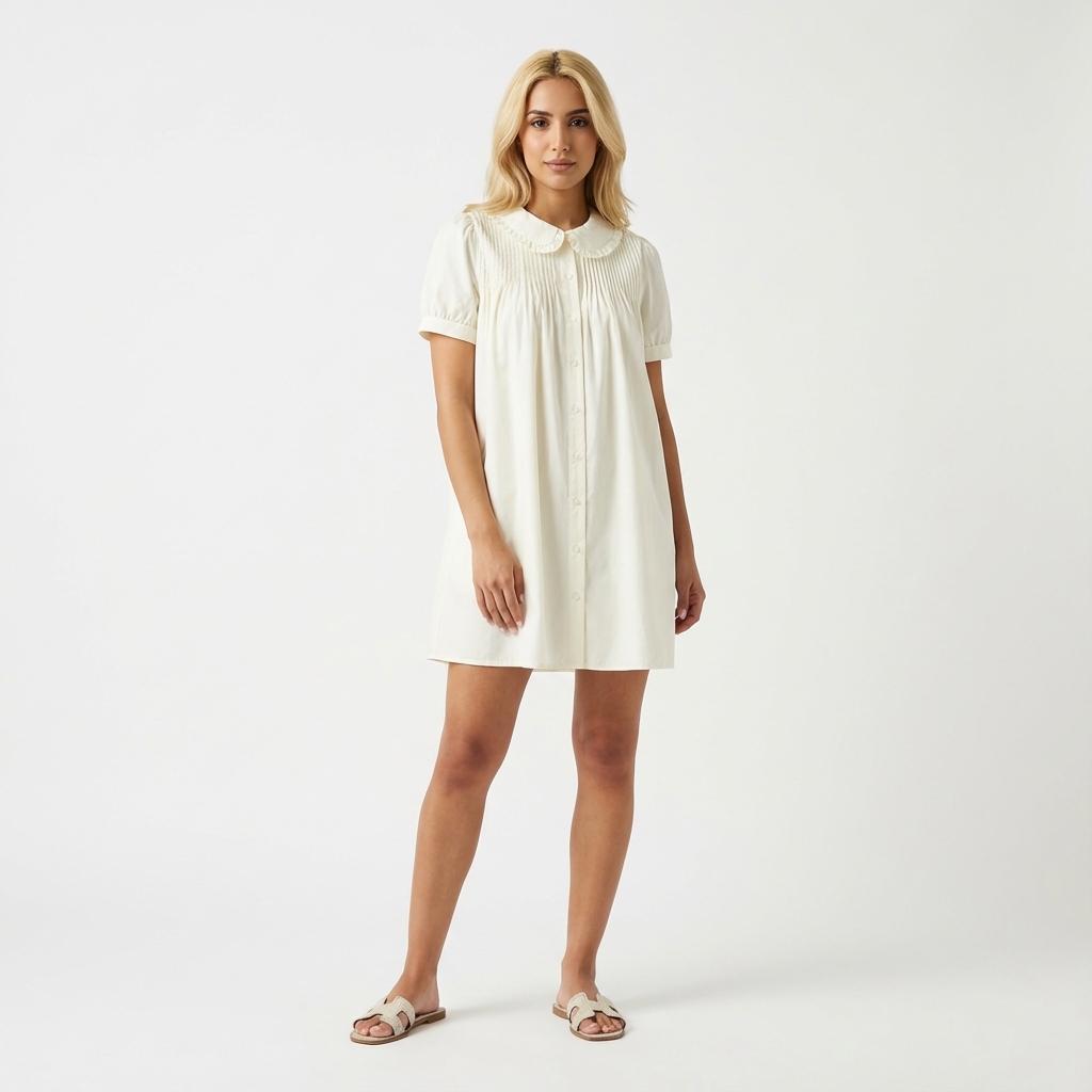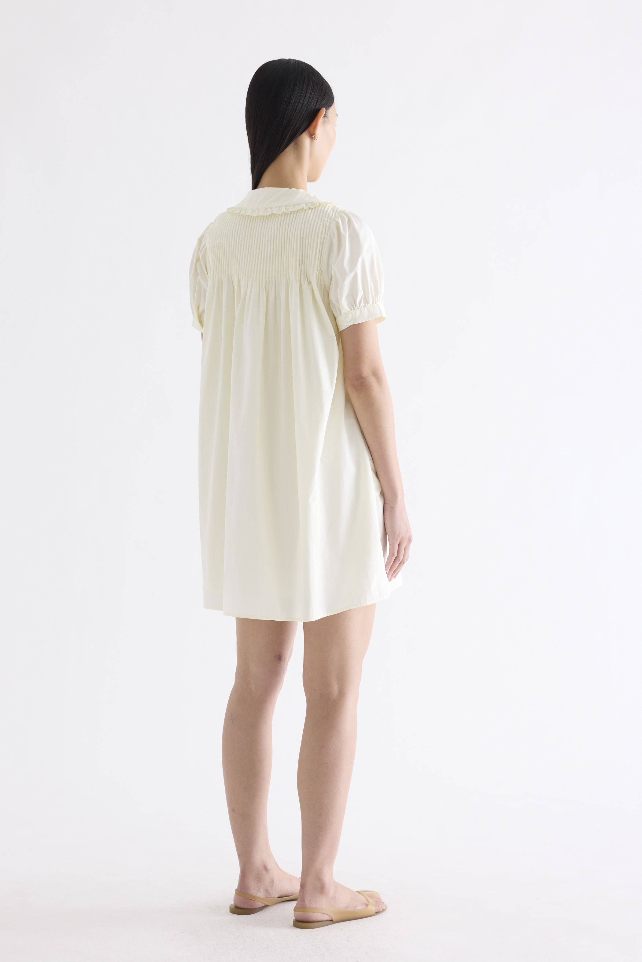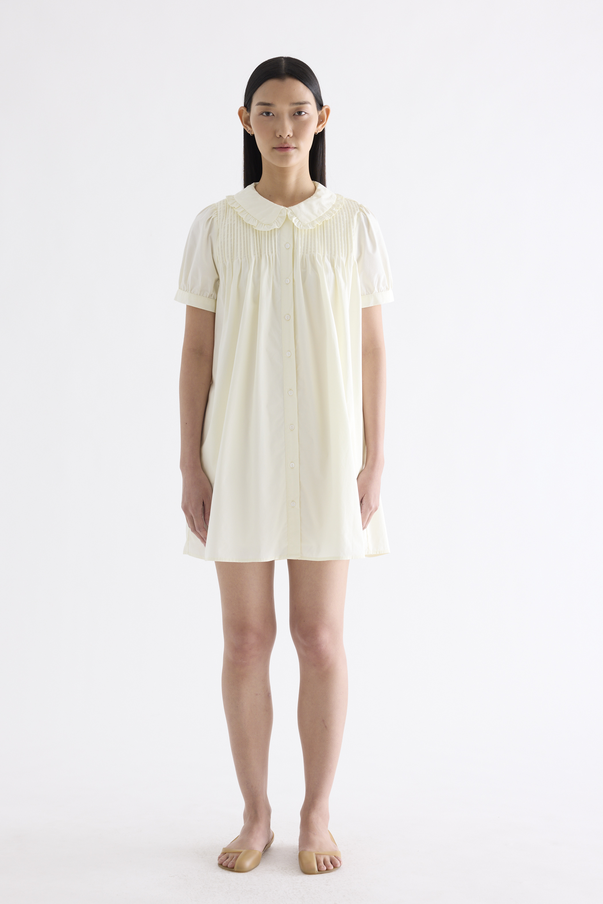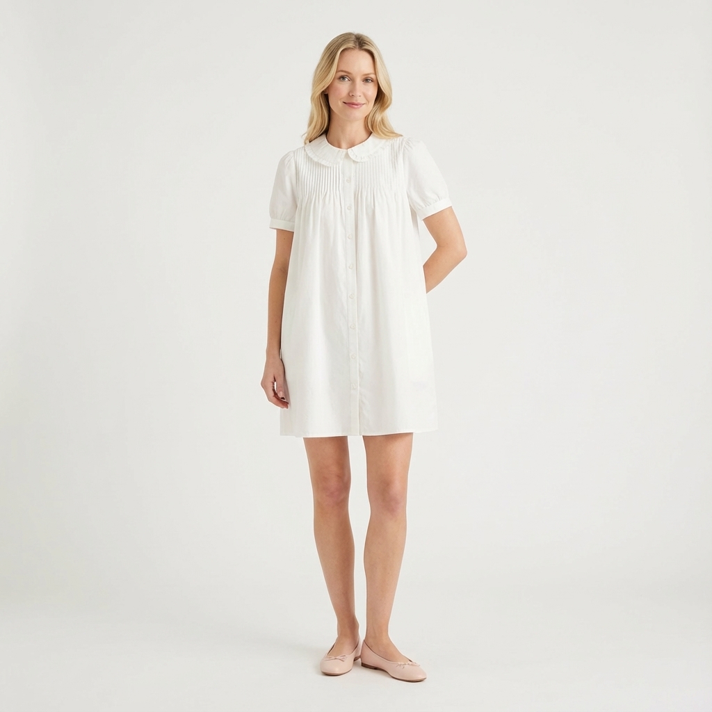 Obsessed. Made from smooth and crisp cotton, this dress features frill-trimmed collars, short puffy sleeves with a buttoned cuff, pin-tuck pleats and a button-down front. Fits relaxed and above the knee.