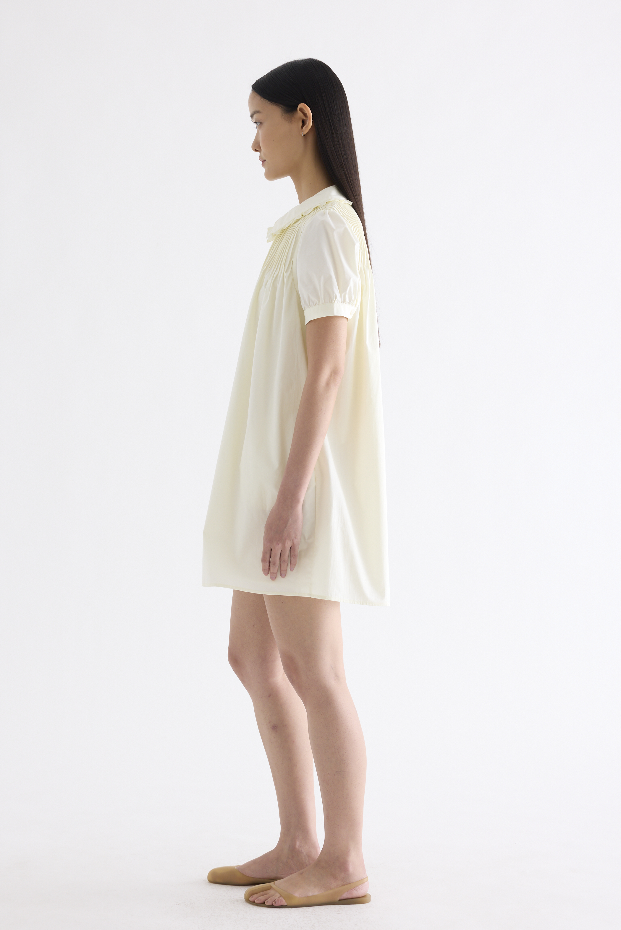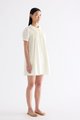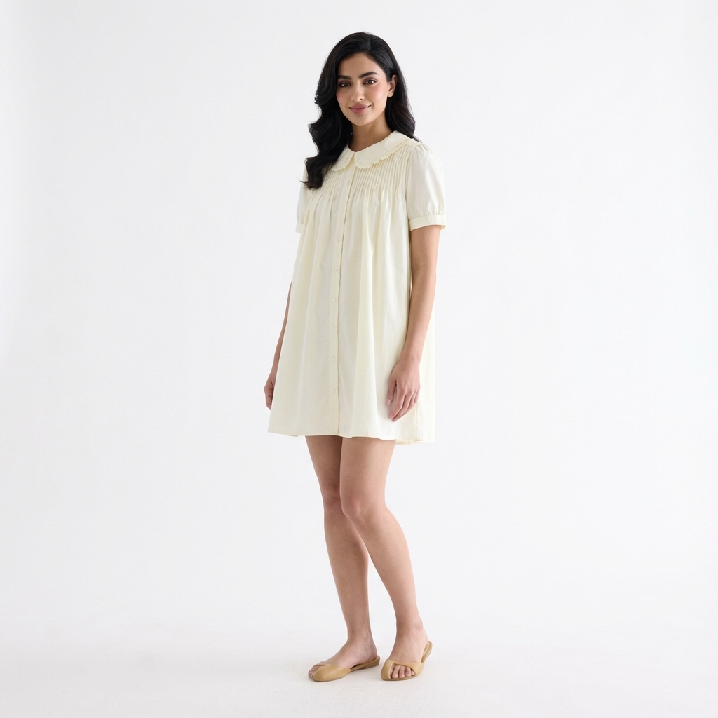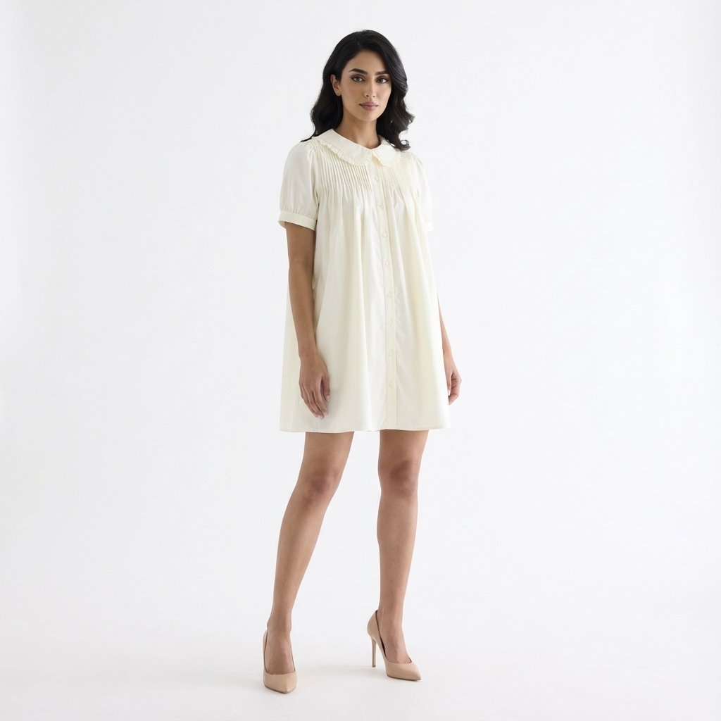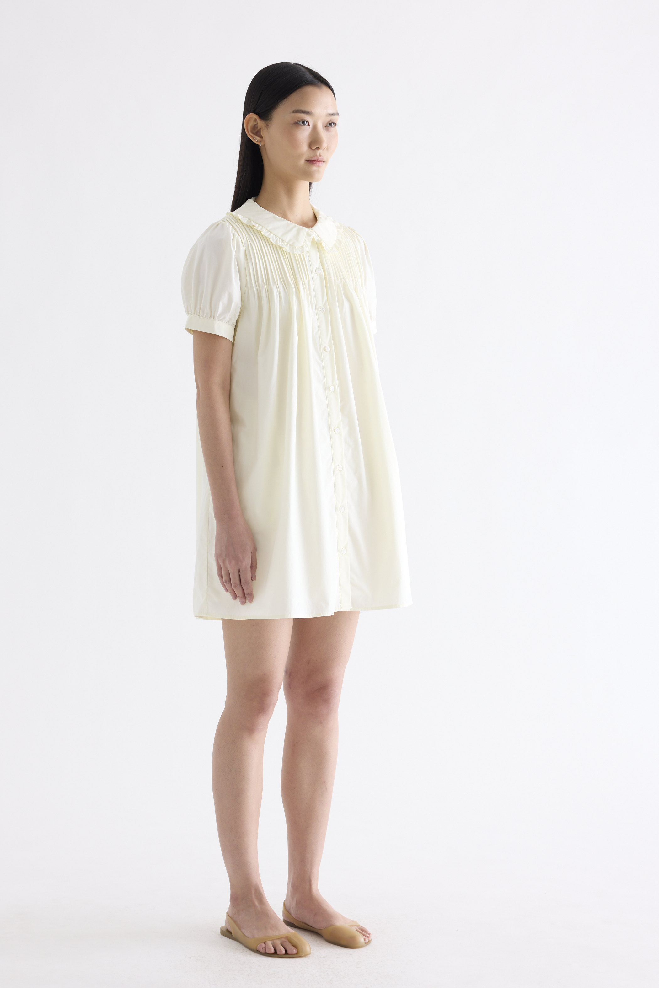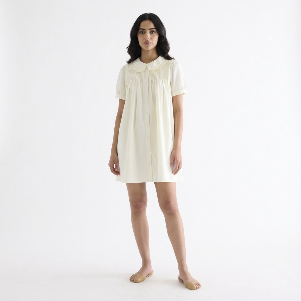 Obsessed. Made from smooth and crisp cotton, this dress features frill-trimmed collars, short puffy sleeves with a buttoned cuff, pin-tuck pleats and a button-down front. Fits relaxed and above the knee.
