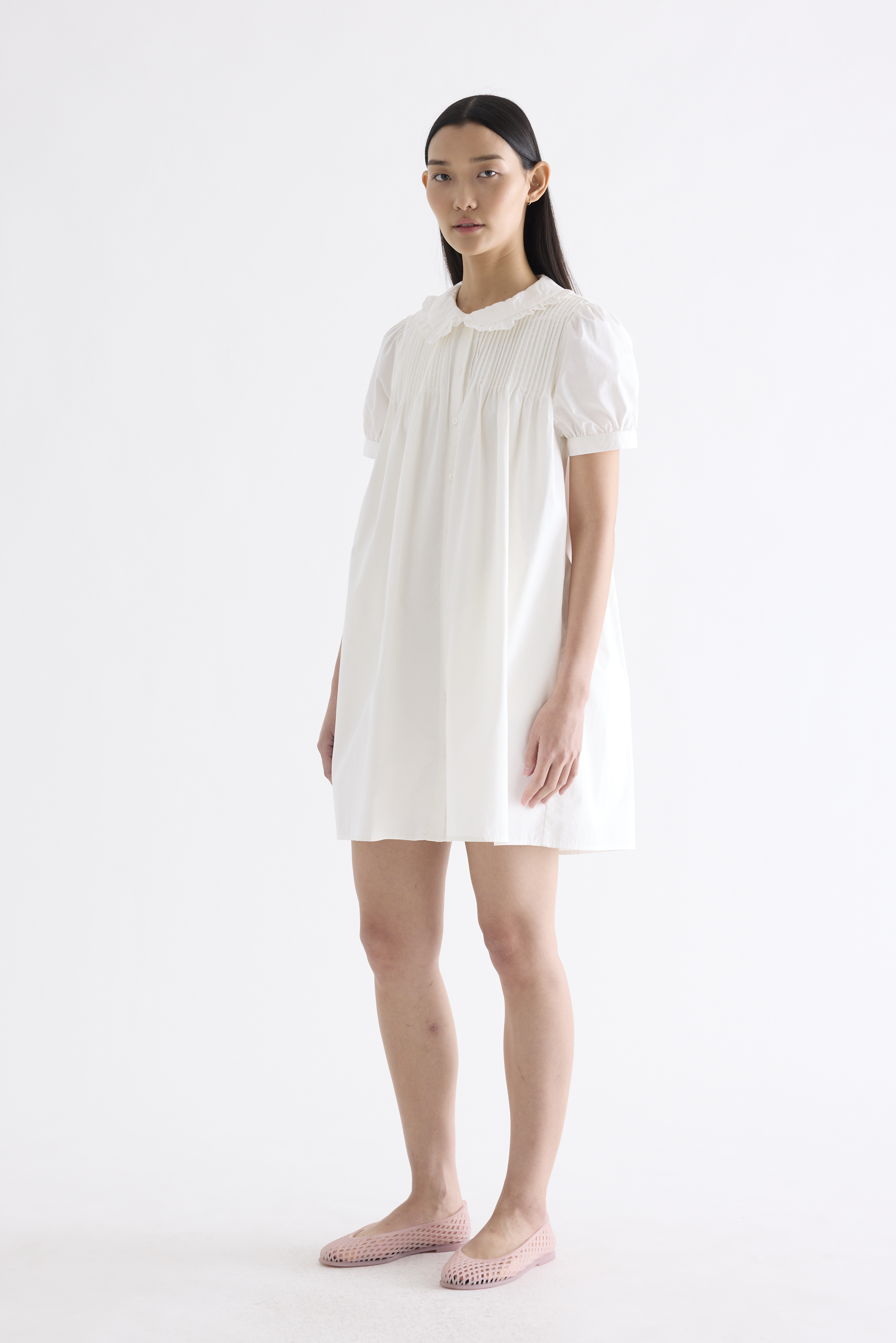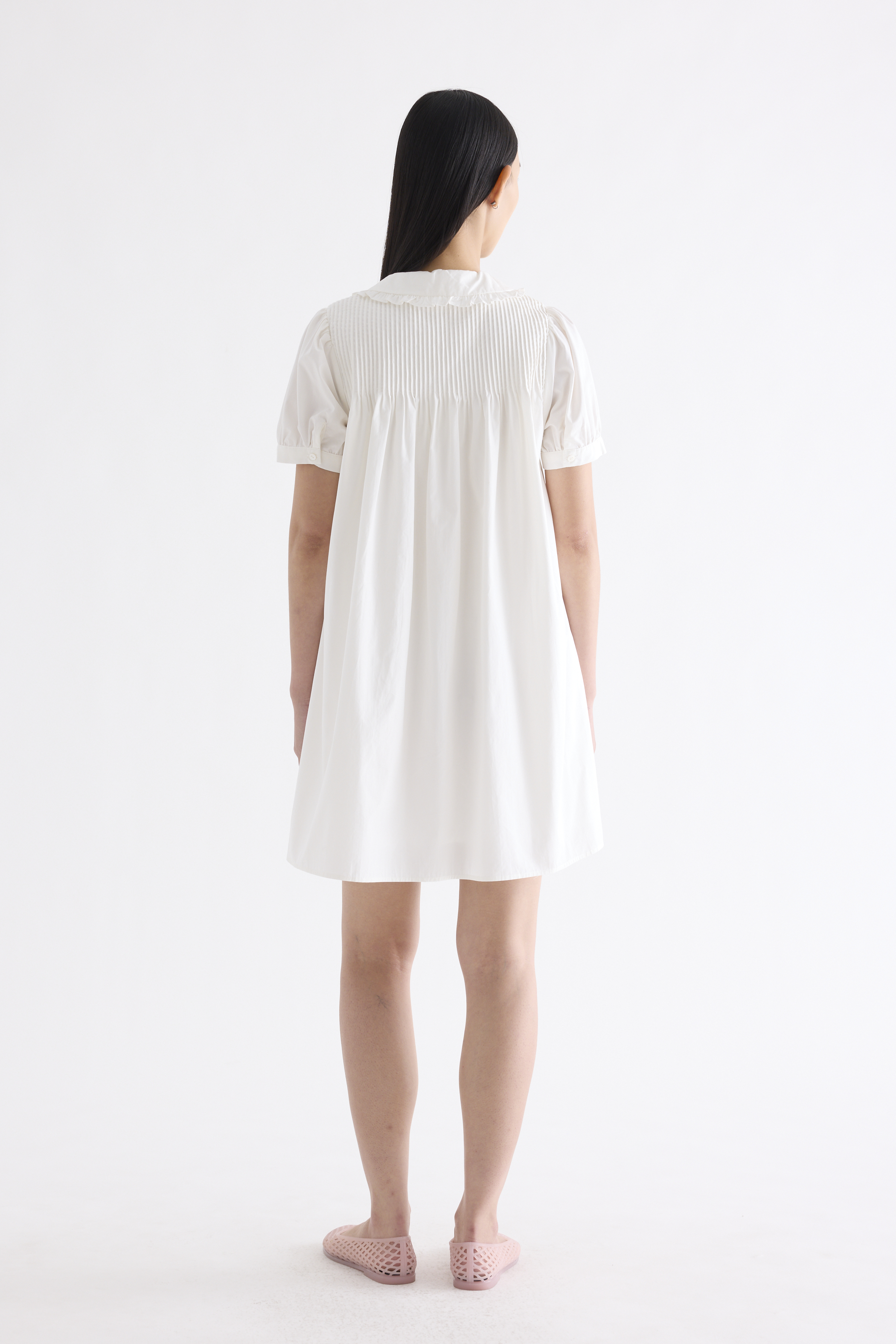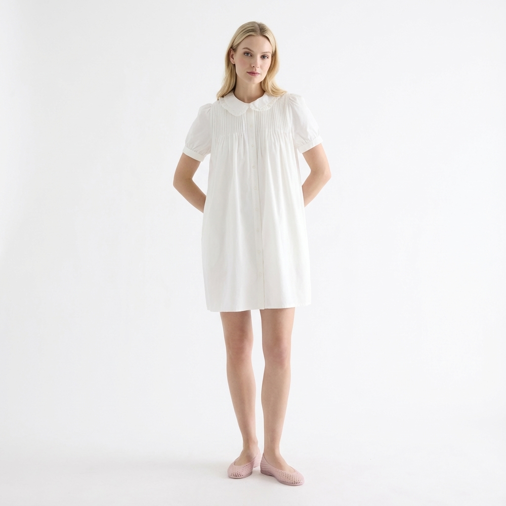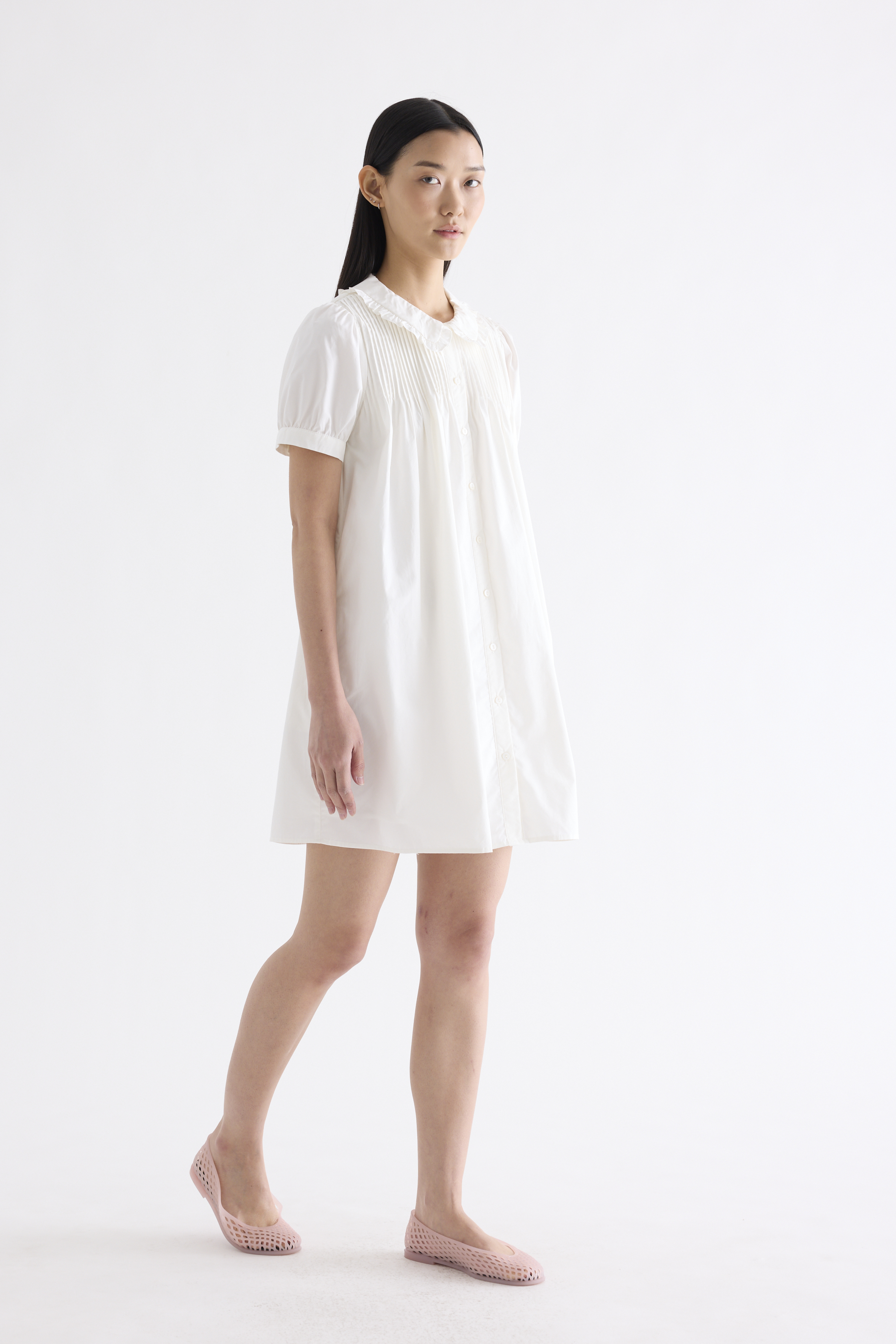 Obsessed. Made from smooth and crisp cotton, this dress features frill-trimmed collars, short puffy sleeves with a buttoned cuff, pin-tuck pleats and a button-down front. Fits relaxed and above the knee.