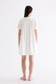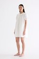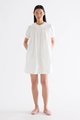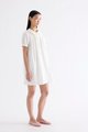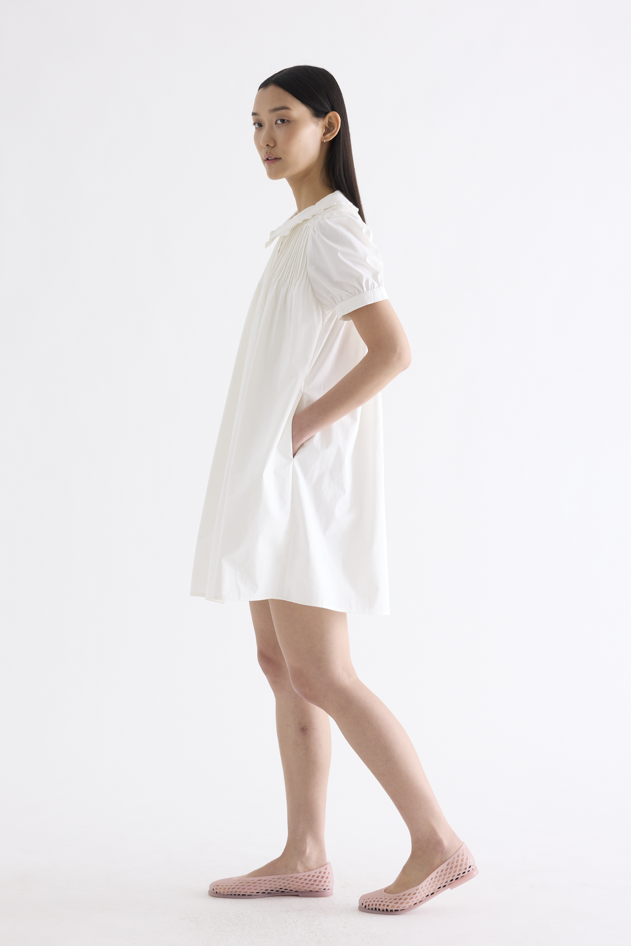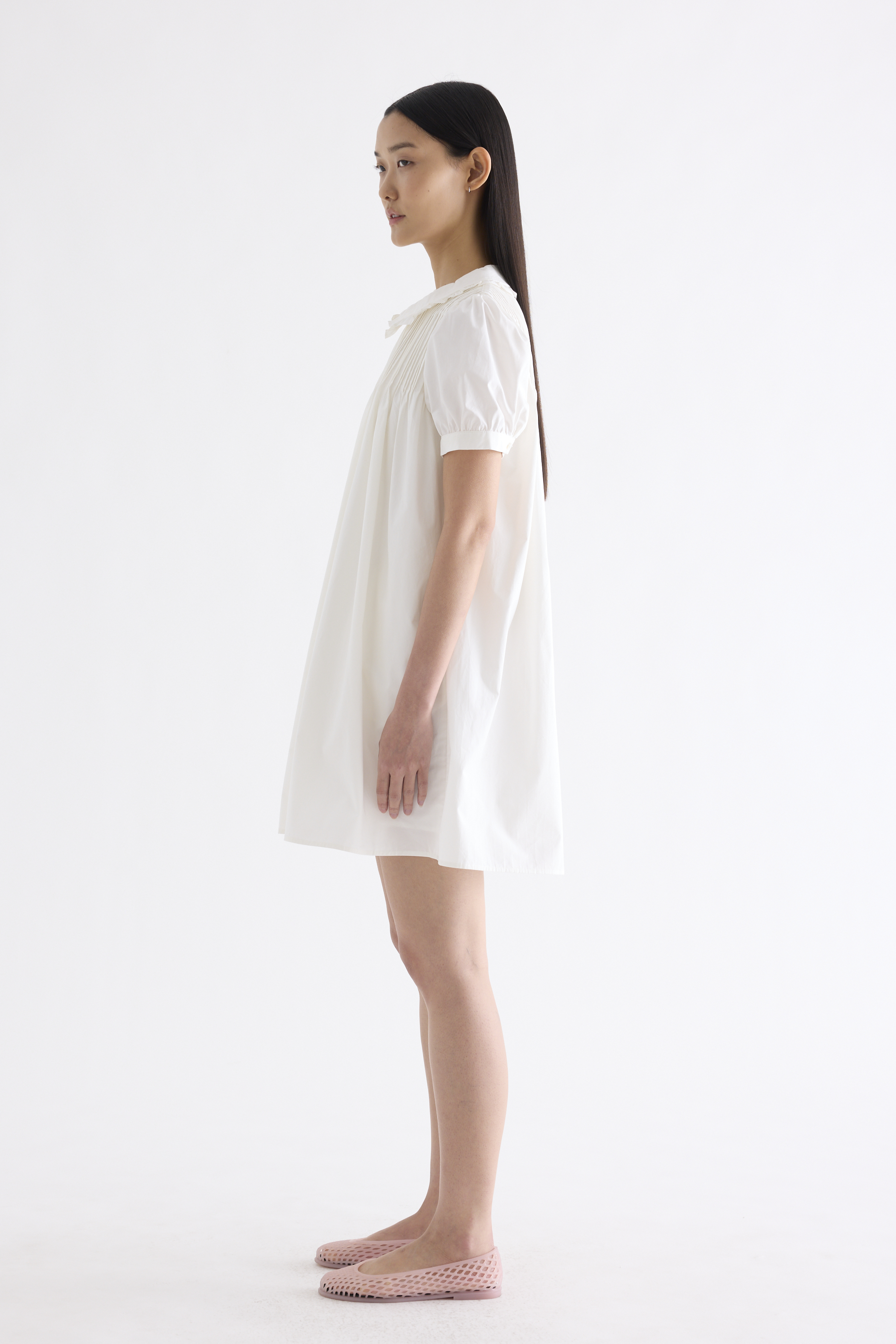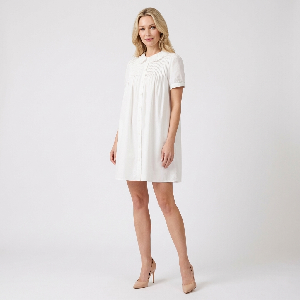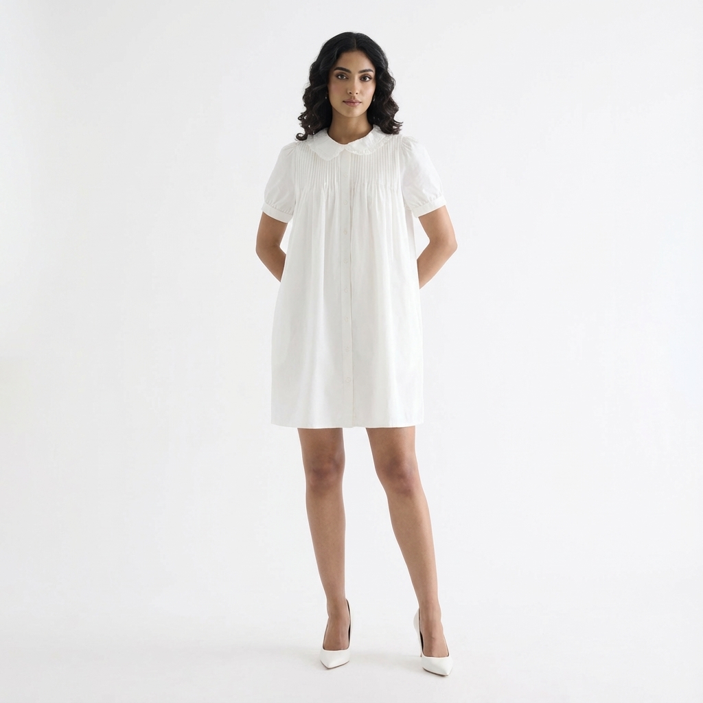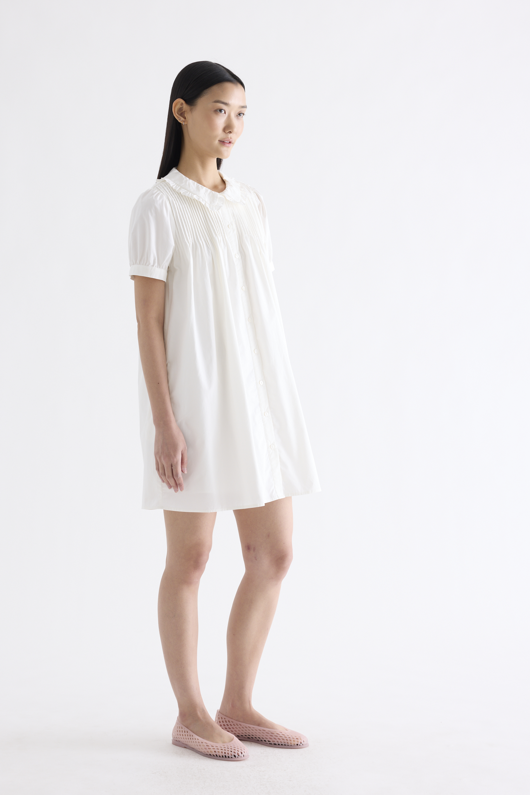 Obsessed. Made from smooth and crisp cotton, this dress features frill-trimmed collars, short puffy sleeves with a buttoned cuff, pin-tuck pleats and a button-down front. Fits relaxed and above the knee.