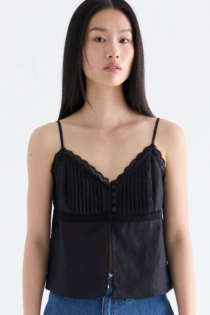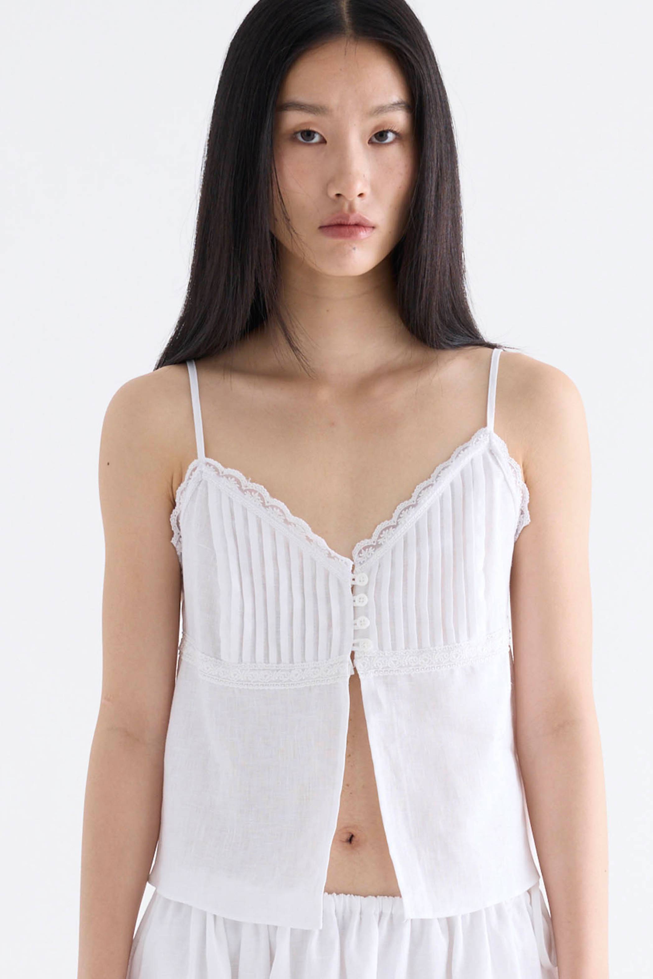 From the Postscript collection. This sleeveless top features a lace-trimmed V-neckline, front slit, half loop buttons and a pleated bust with a lace border. Fits relaxed with adjustable shoulder straps.
