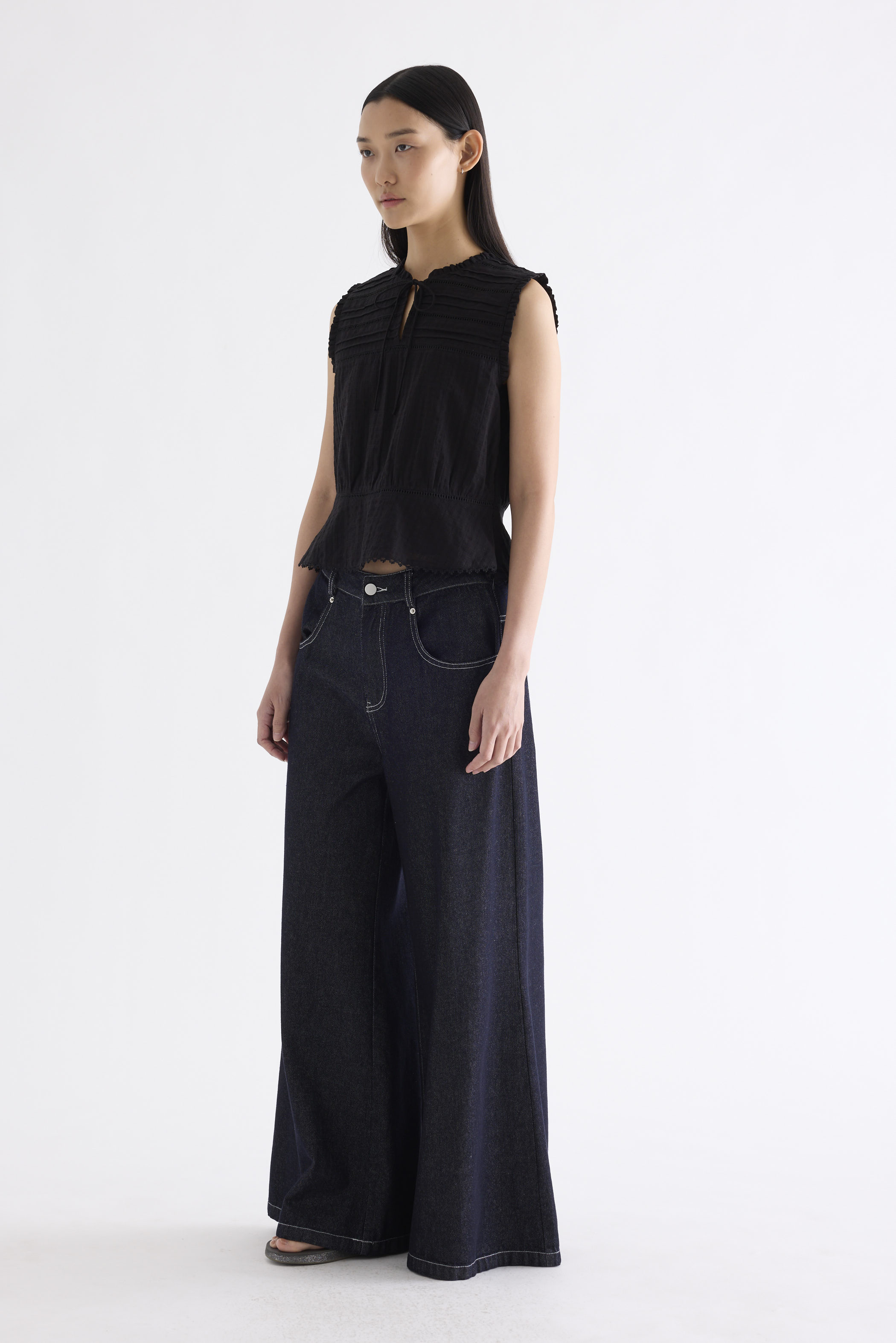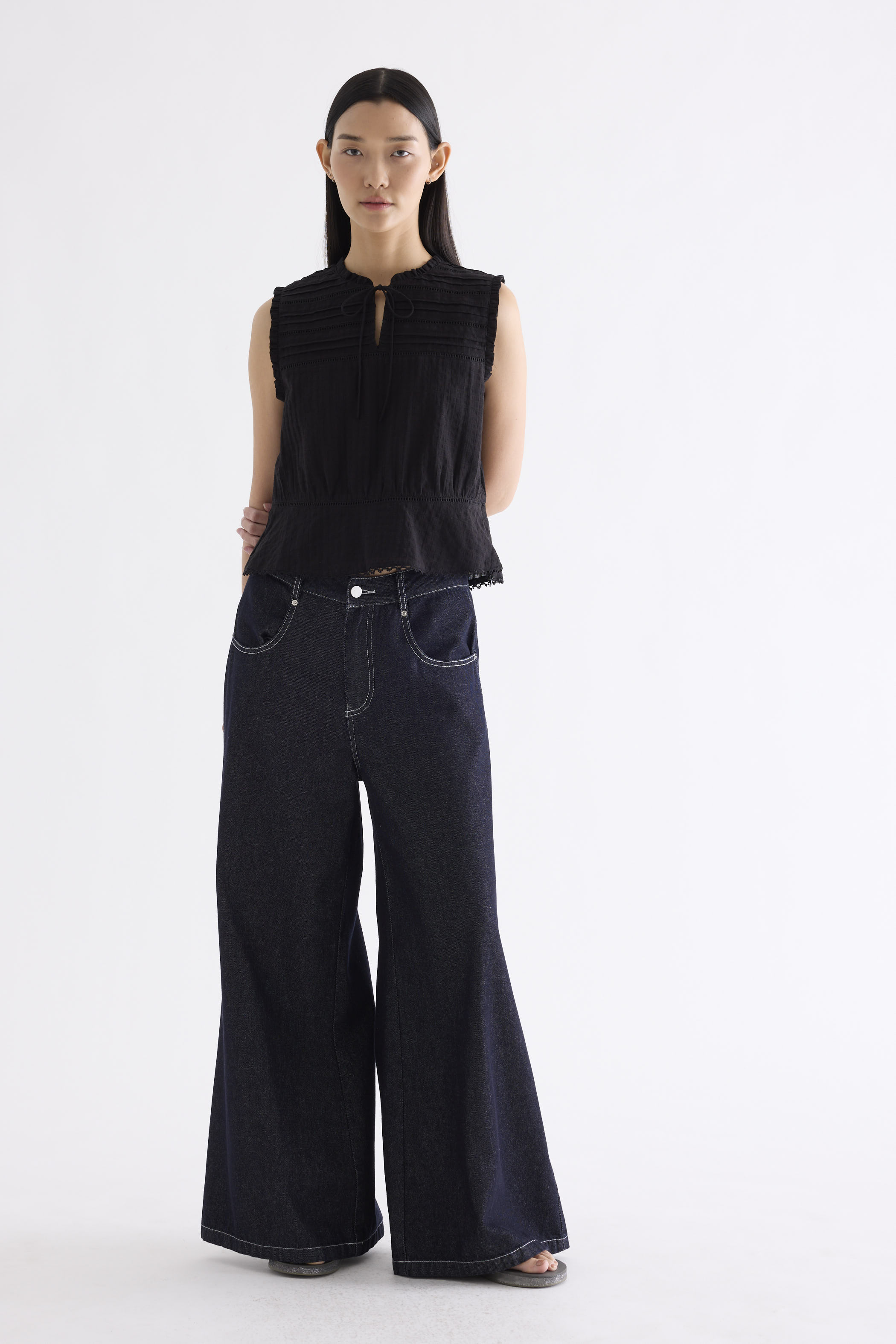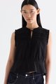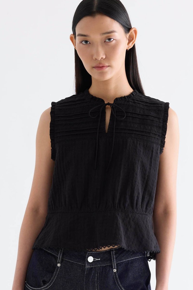Warm-weather approved. Cut from airy and softly structured seersucker cotton, this top features a frill-trimmed neckline, front keyhole opening with tie-strap, pleat and lace detailing, as well as a lace-trimmed hem. Worn in a slim fit with a side zip closure.