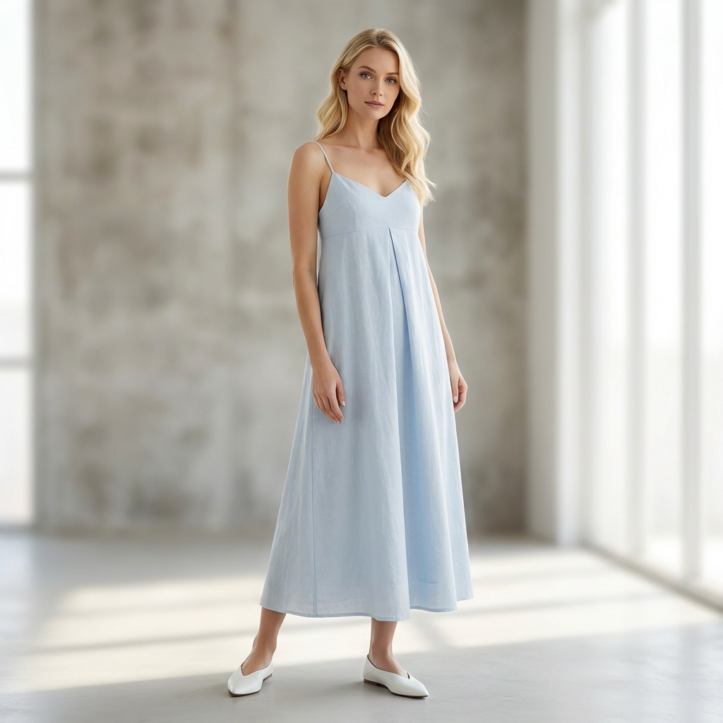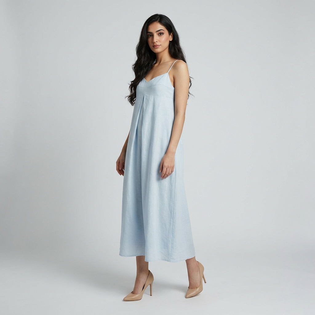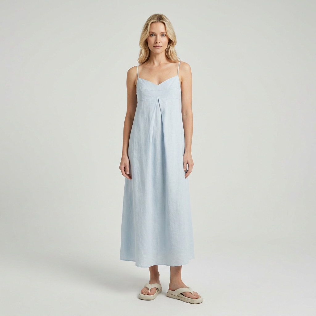 Warm-weather essential. Made from airy and gently tailored 100% linen, this sleeveless maxi dress features a dipped neckline, a front pleat, a panelled bust, slim adjustable shoulder straps, a partially elasticated back and a side zip closure. Worn in a slim fit.