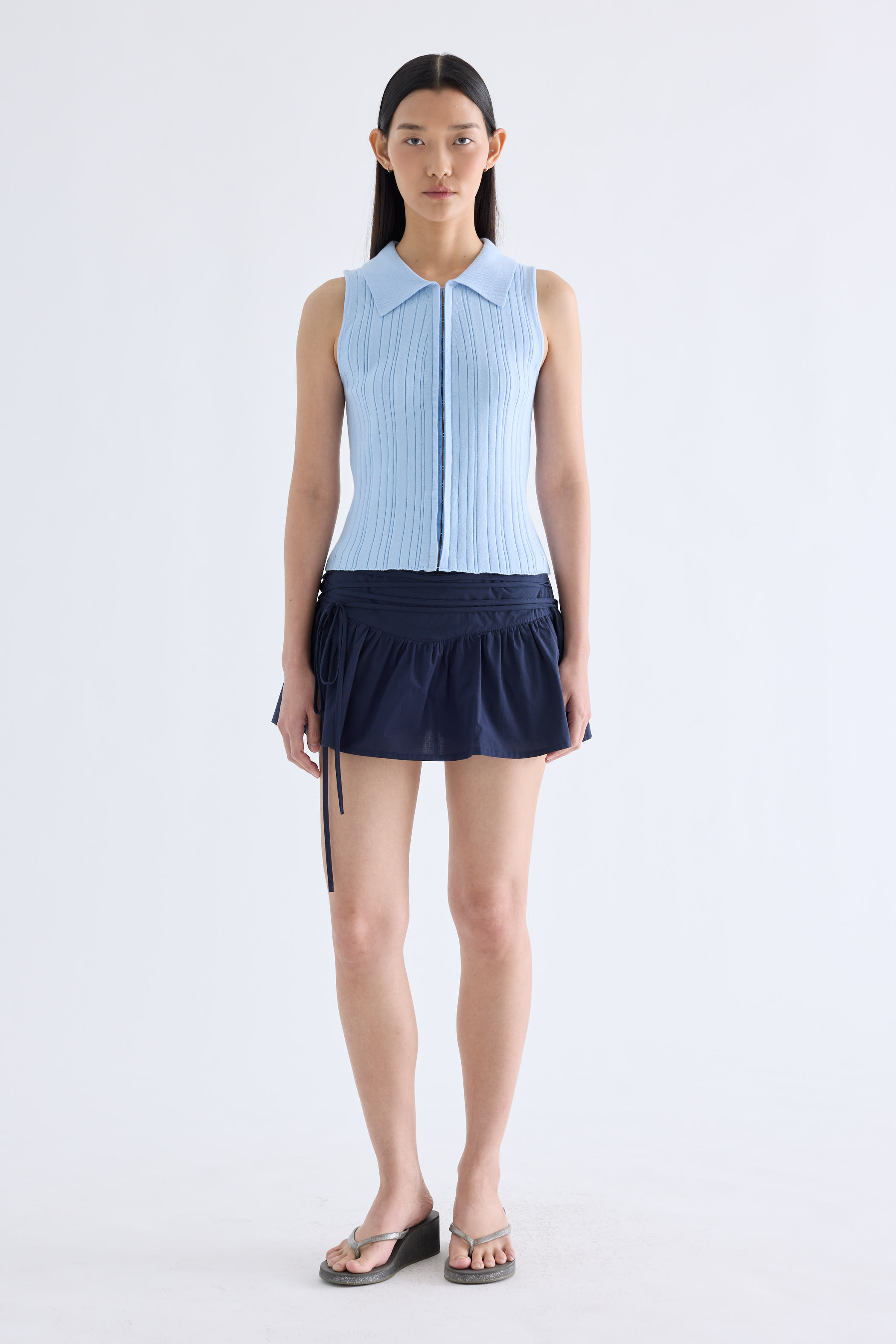 Cosy. Made from soft and ribbed knit, this sleeveless tank features a collared neckline and front hook-and-eye closures. Worn in a slim fit.