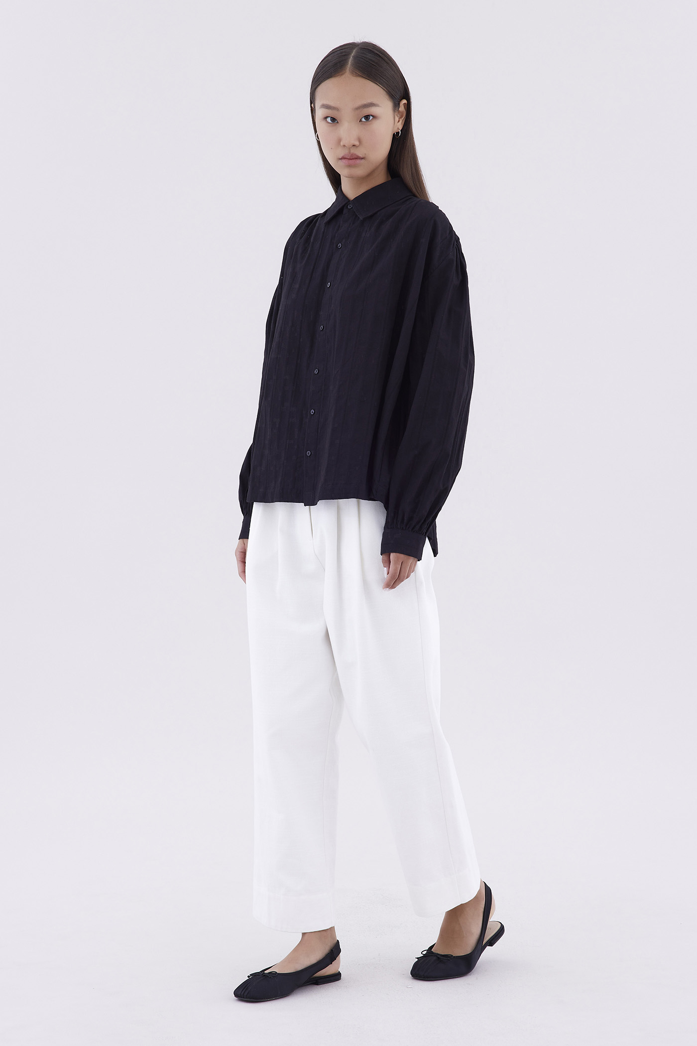 Essential. Made from textured and striped cotton, this shirt features gathered shoulders, buttoned long sleeves and a button-down front. Worn in a relaxed, oversized fit.