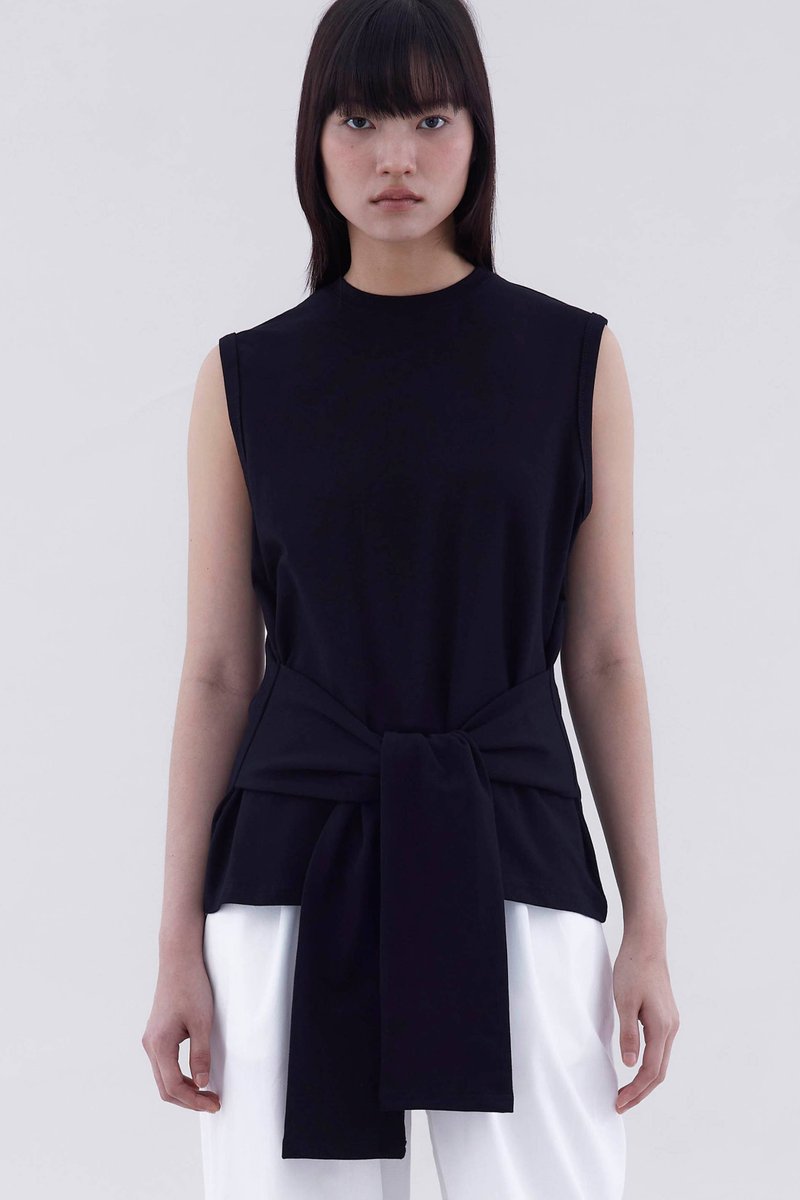 Two in one. Made from soft and stretchy fabric, this sleeveless tee features a round neckline and waist-tie strap.