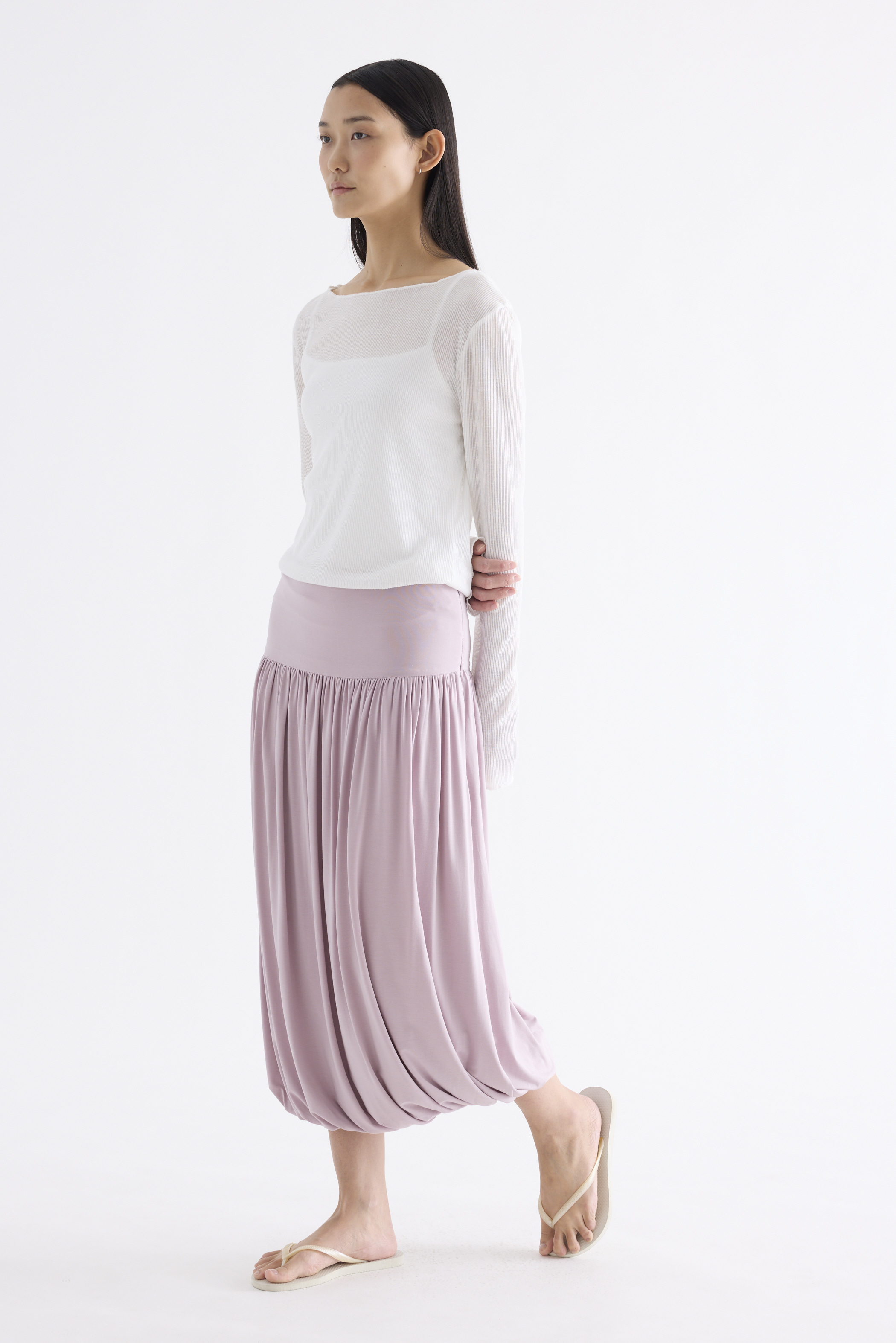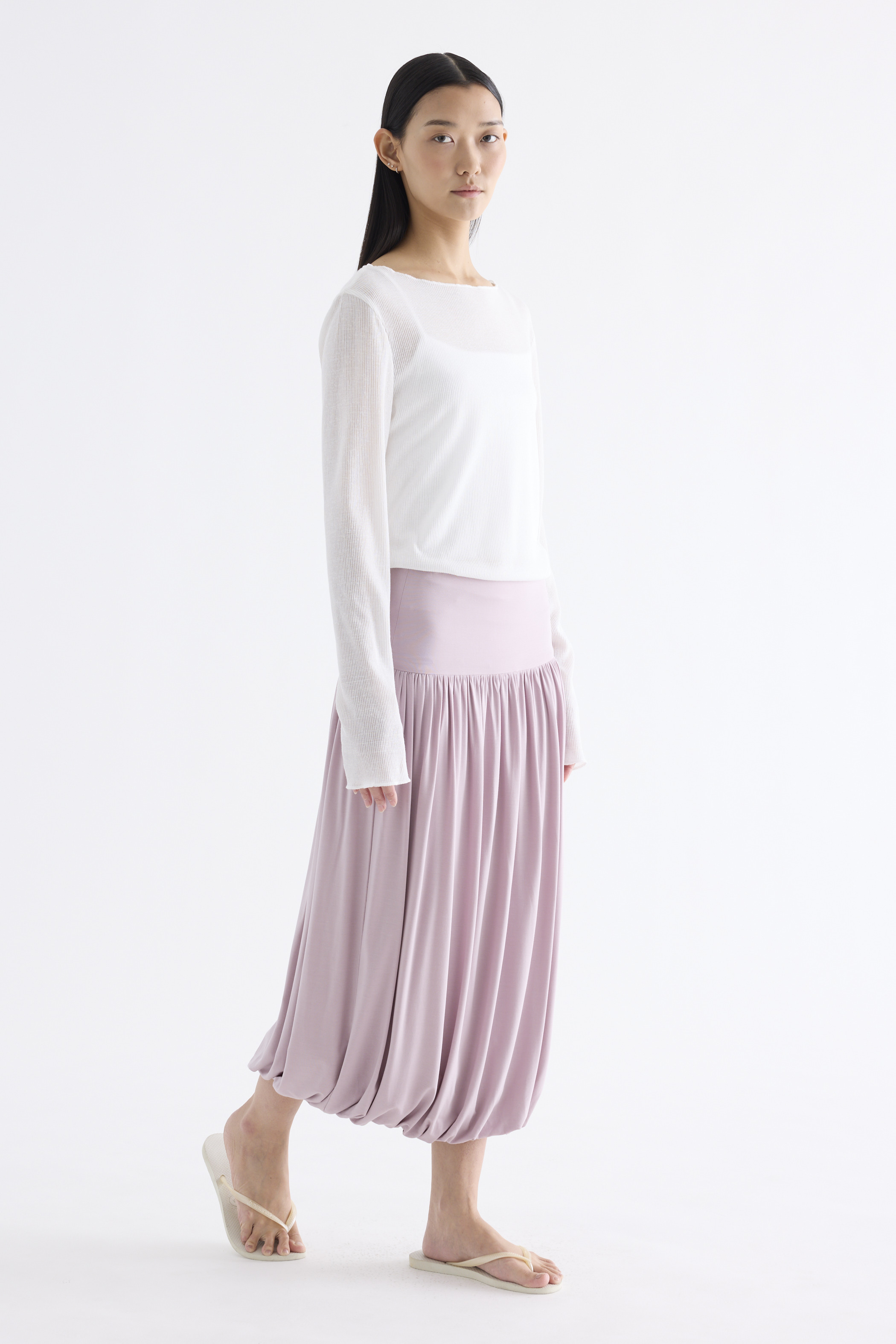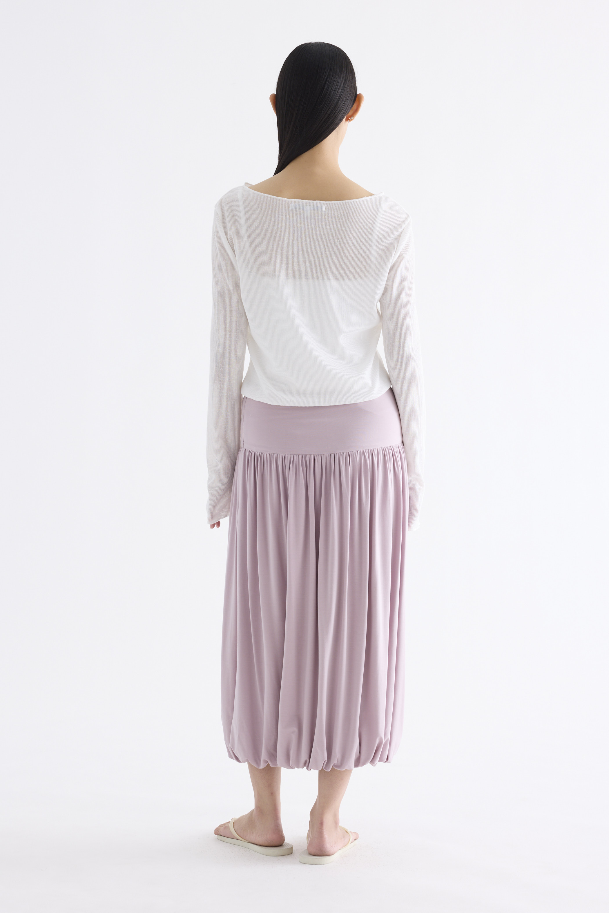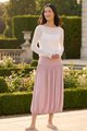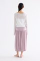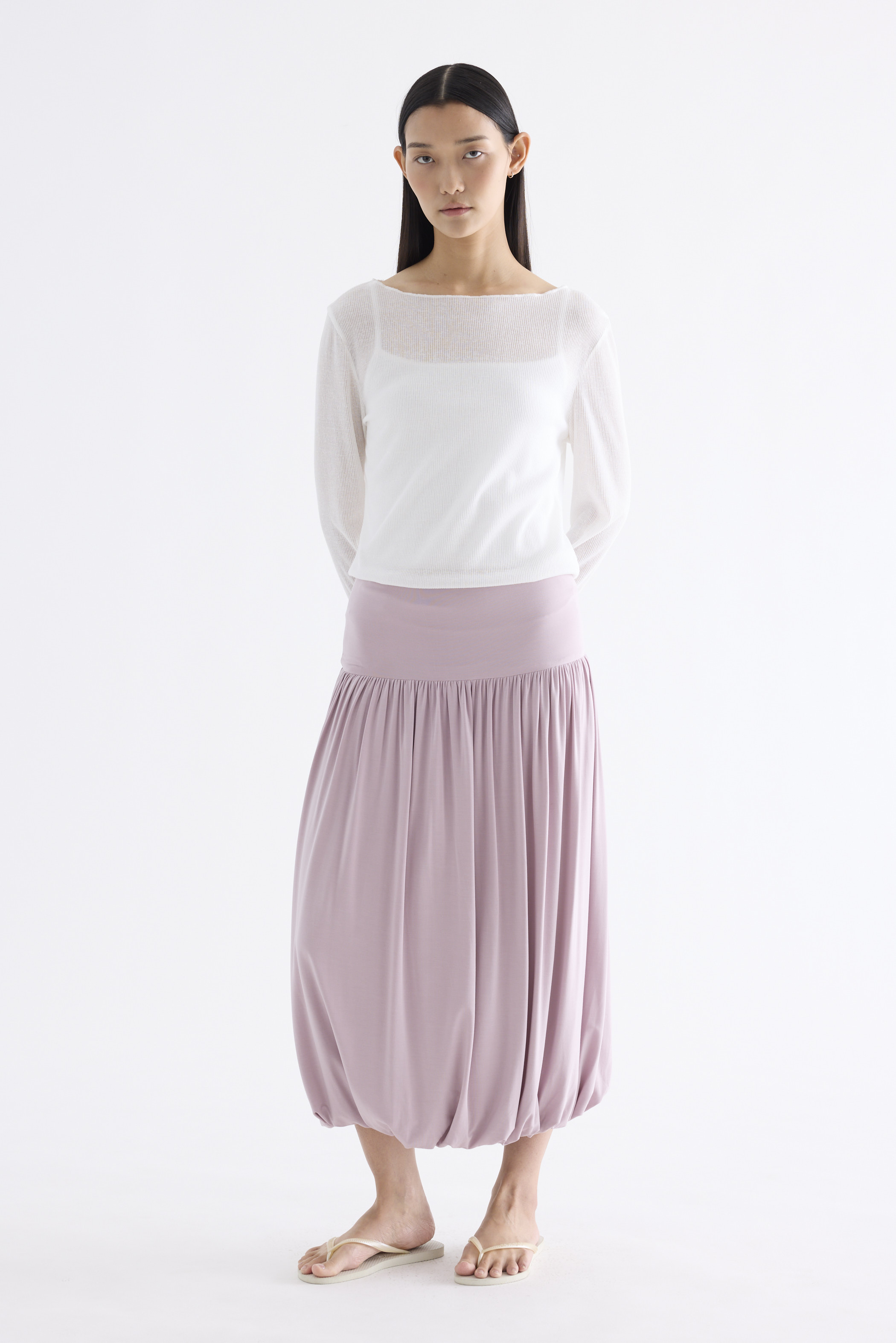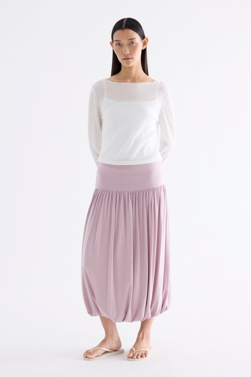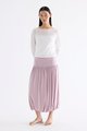 Volume, up. Made from smooth and stretchy fabric, this midi skirt features an extended waist panel and a gathered silhouette with a bubble hem. Worn in a relaxed fit with a size zip closure.