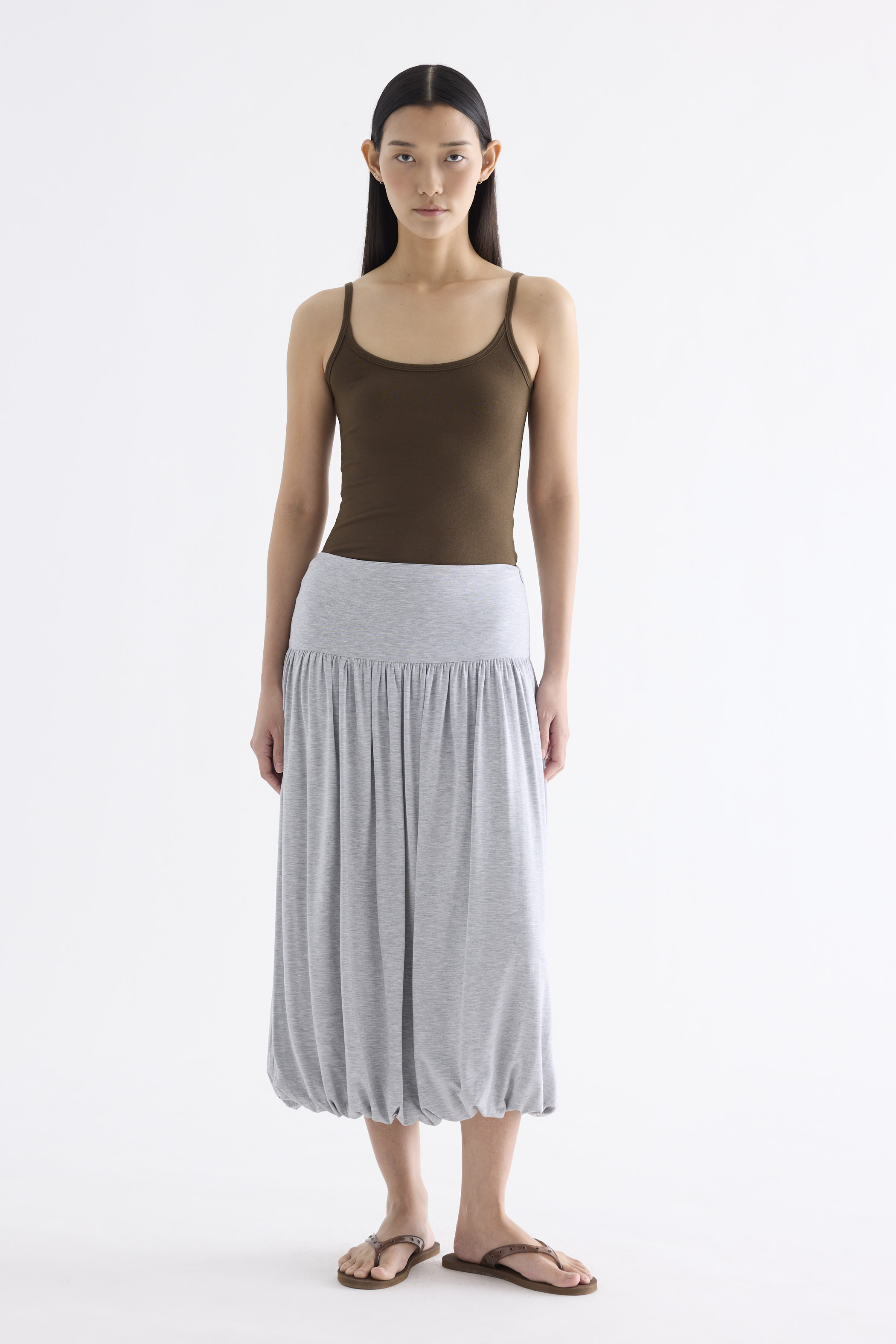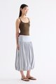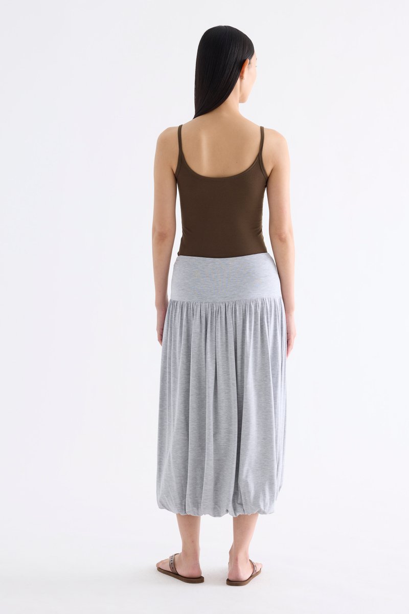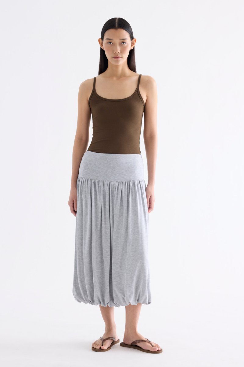 Volume, up. Made from smooth and stretchy fabric, this midi skirt features an extended waist panel and a gathered silhouette with a bubble hem. Worn in a relaxed fit with a size zip closure.