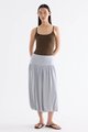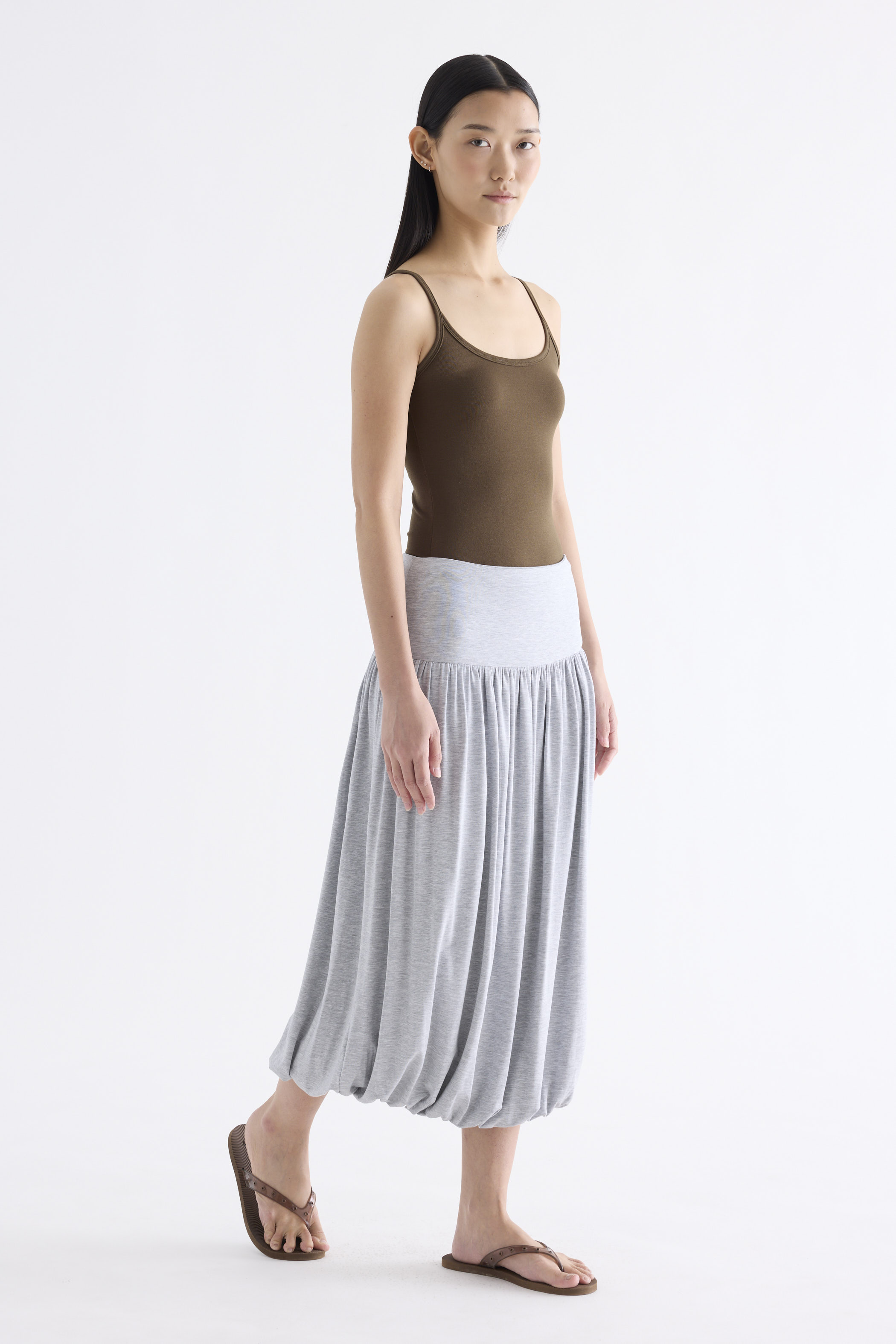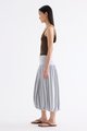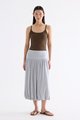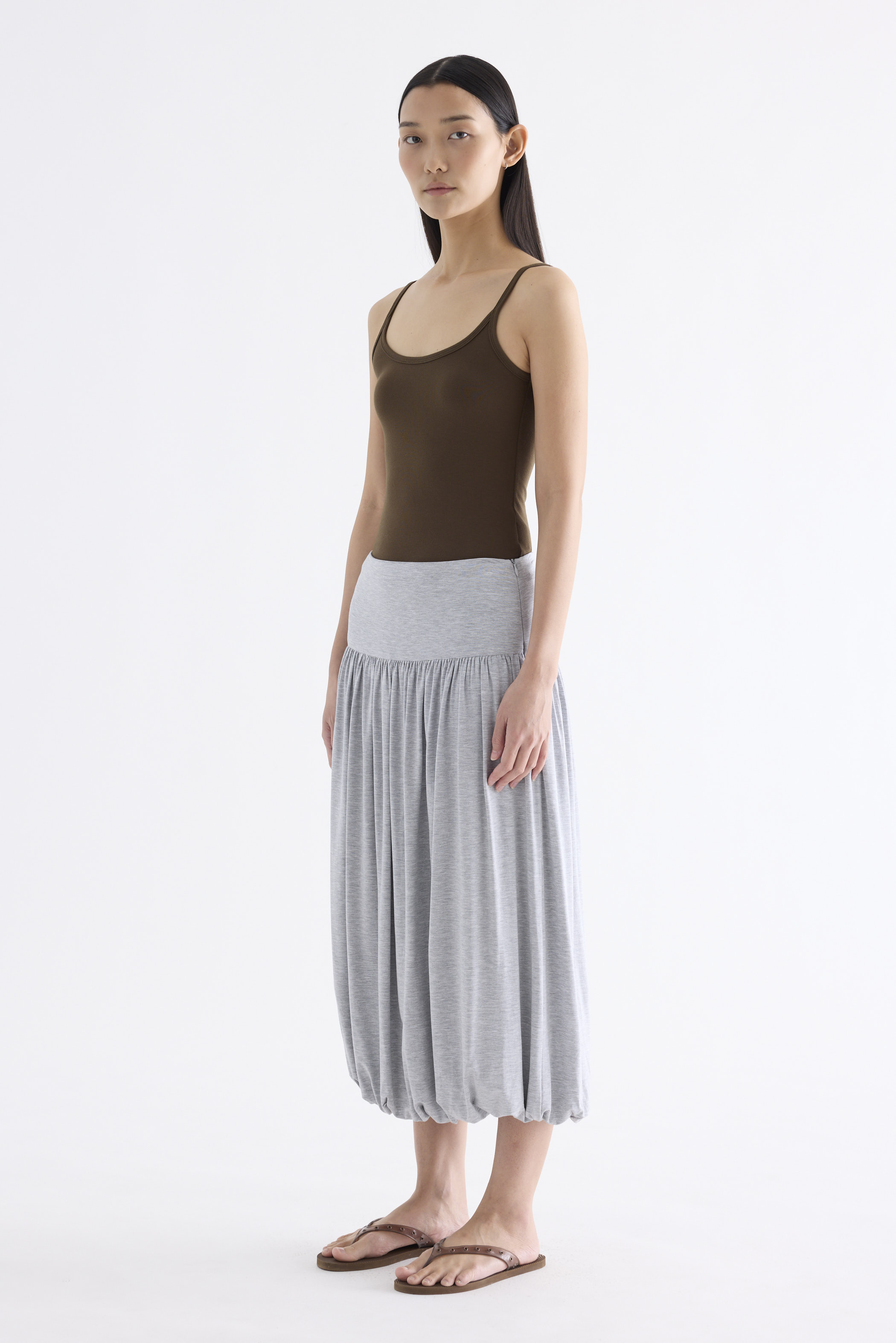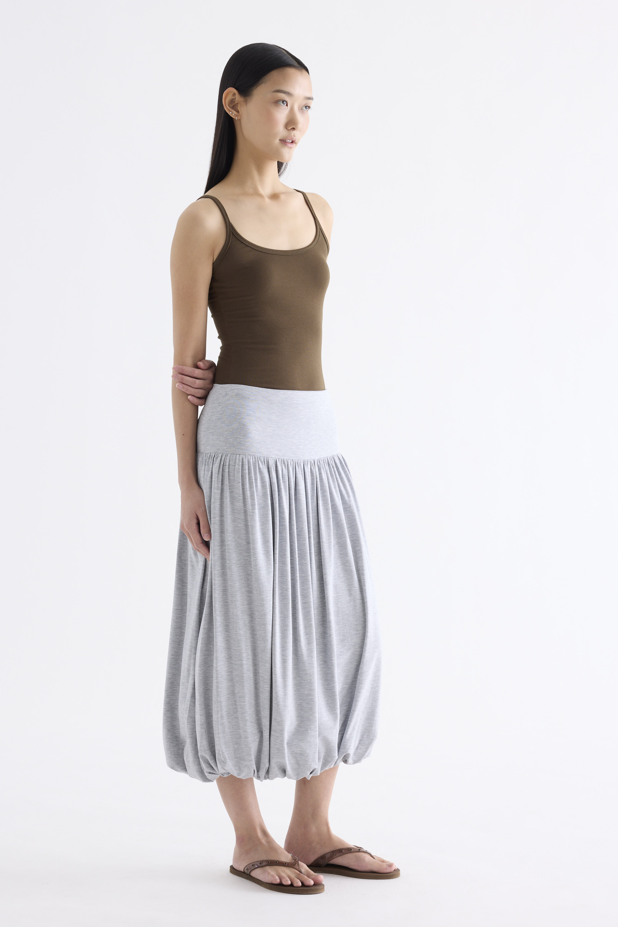 Volume, up. Made from smooth and stretchy fabric, this midi skirt features an extended waist panel and a gathered silhouette with a bubble hem. Worn in a relaxed fit with a size zip closure.