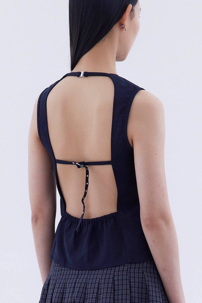 Twice as bold. Made from softly structured fabric, this sleeveless top features a round neckline, panelled construction and an elasticated back opening with connecting straps. Worn in a slim fit.