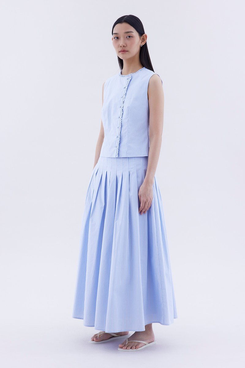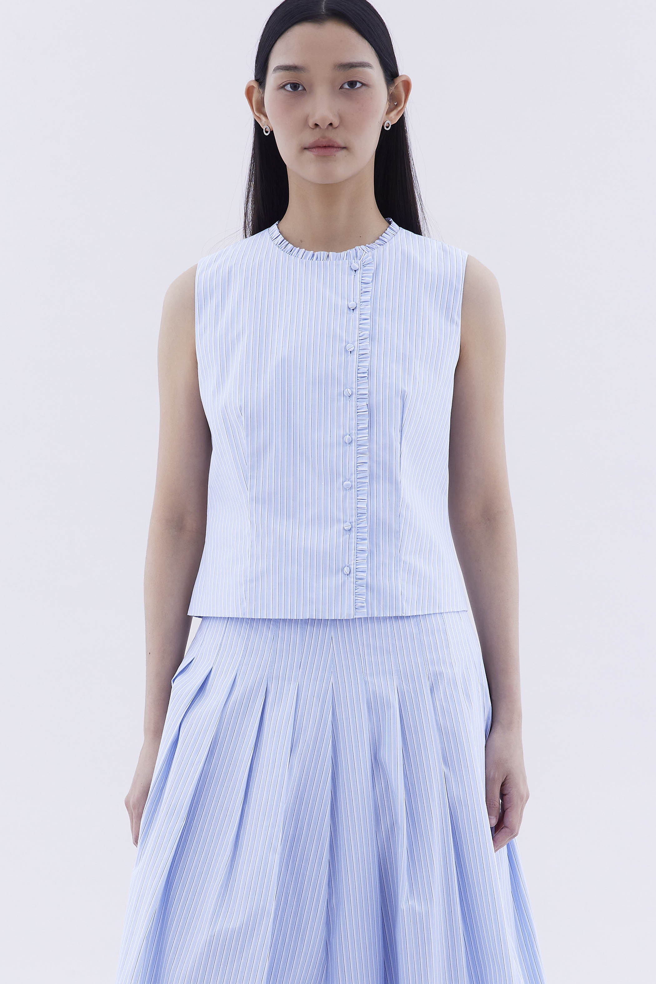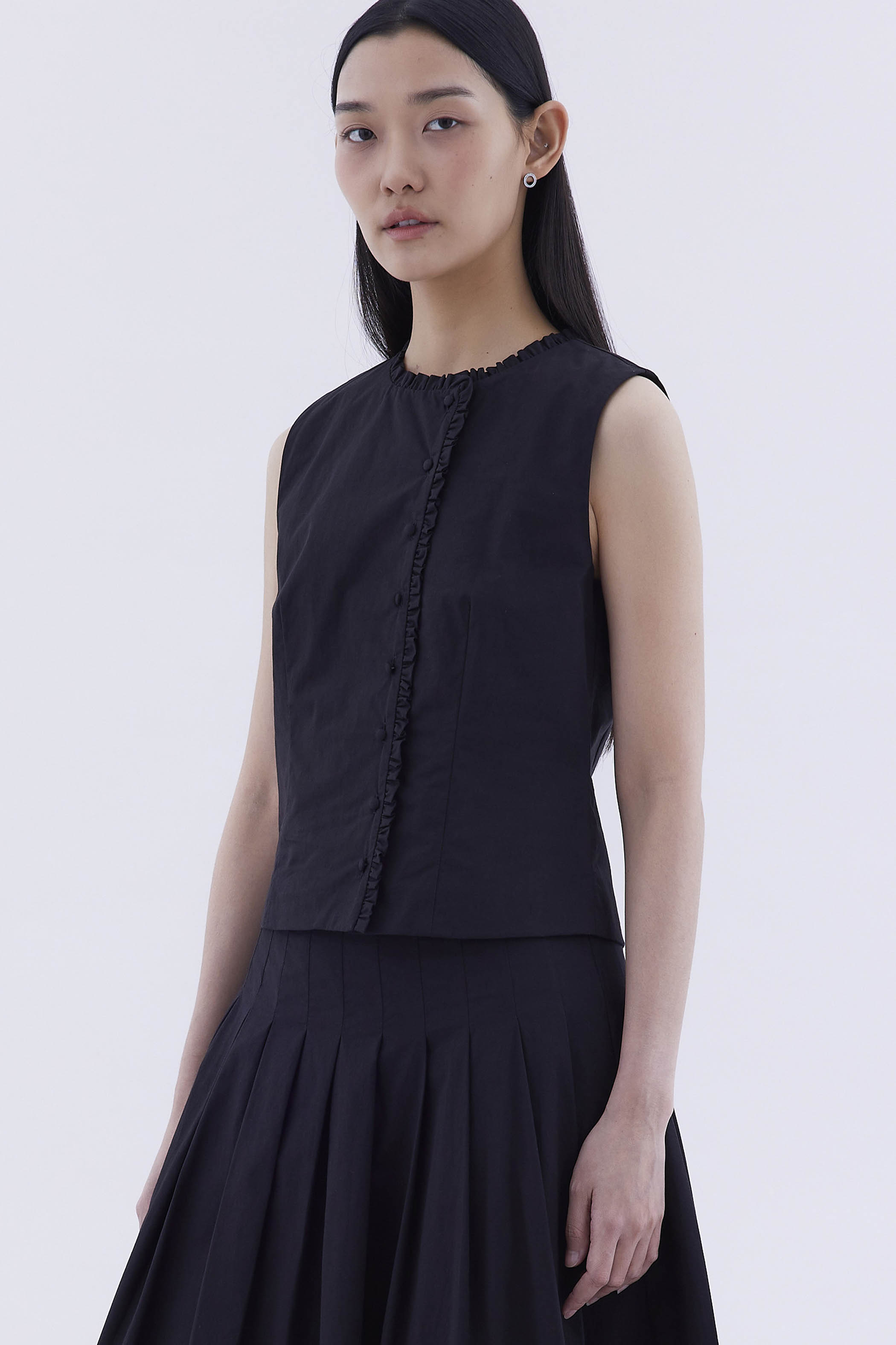 Textured and tailored. Made from crisp and softly structured cotton, this sleeveless top features a ruffle-trimmed round neckline and button-down front. Worn in a slim fit.