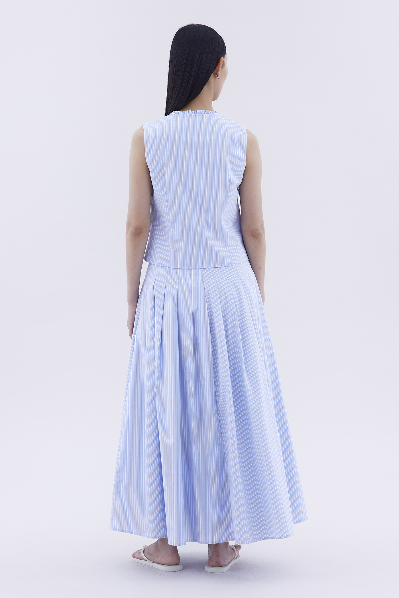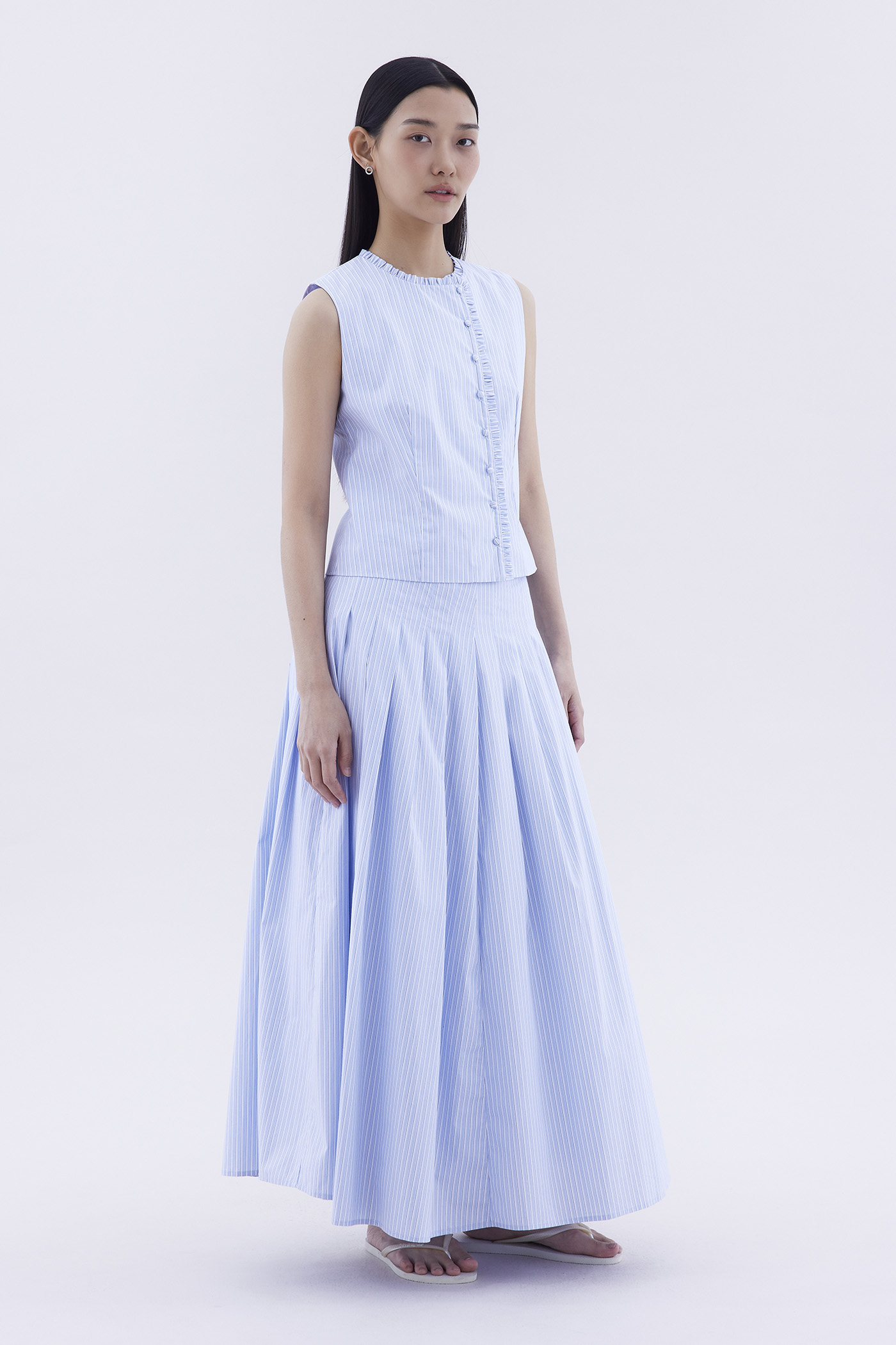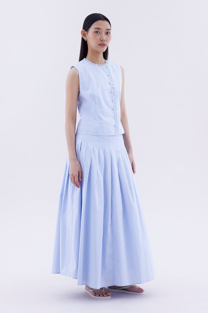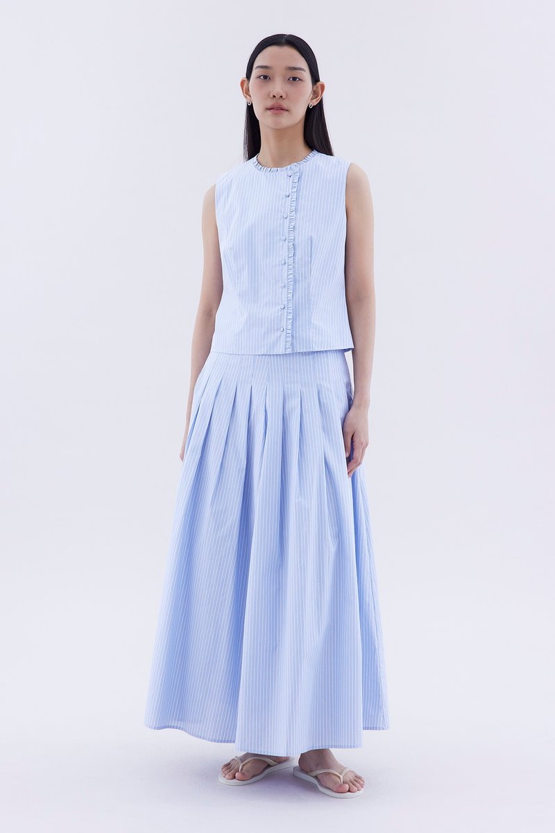Textured and tailored. Made from crisp and softly structured cotton, this sleeveless top features a ruffle-trimmed round neckline and button-down front. Worn in a slim fit.