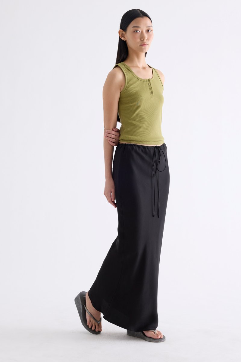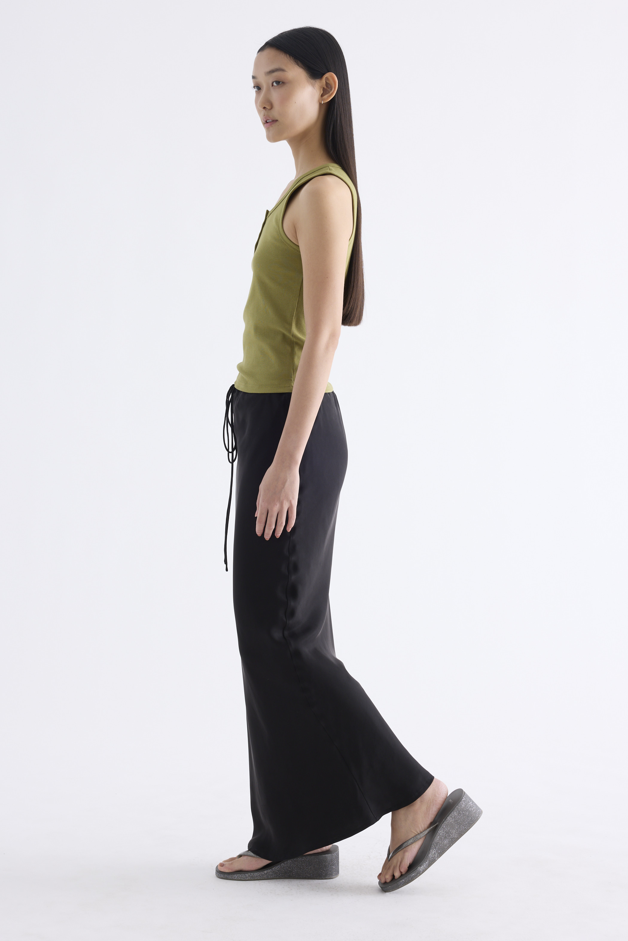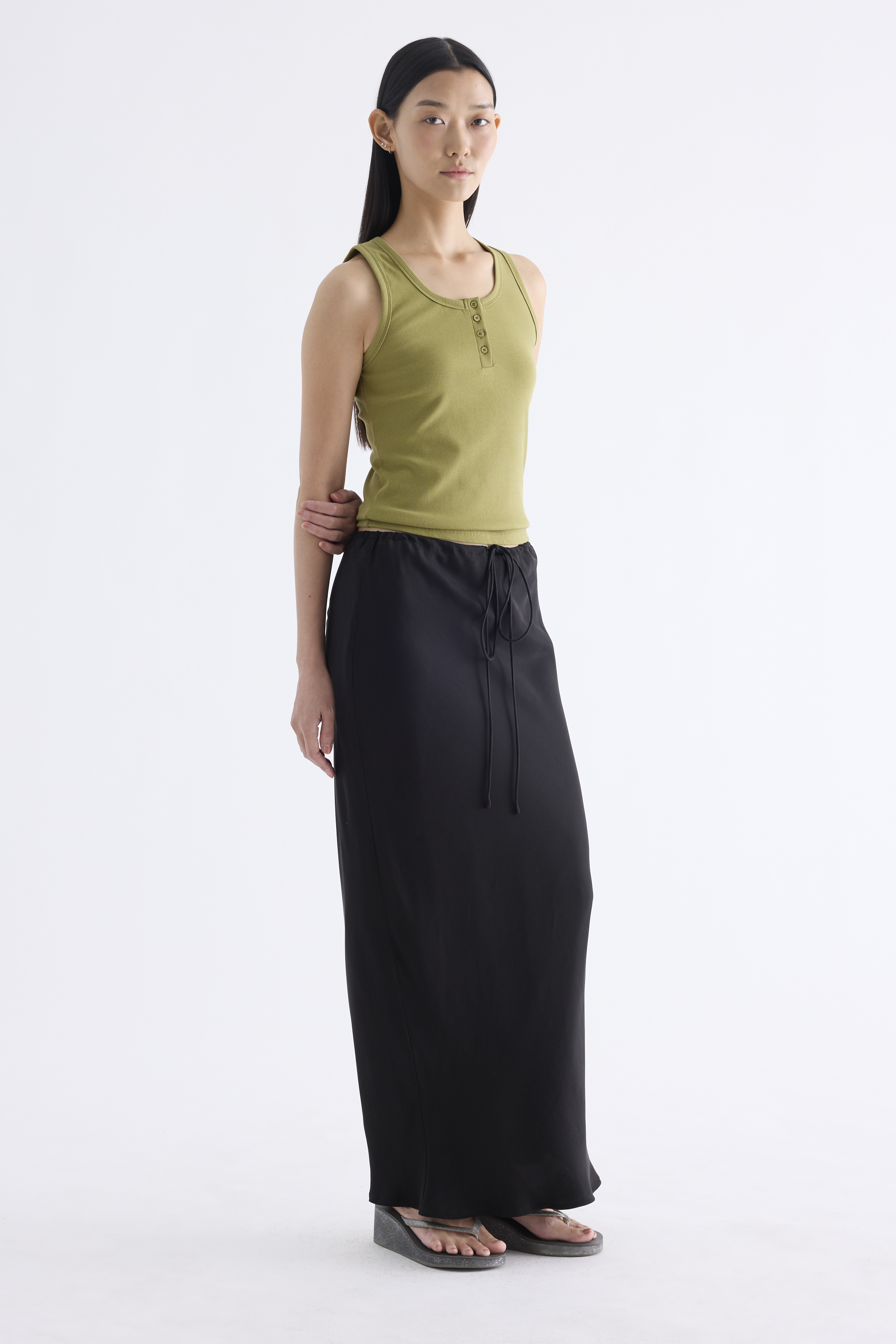 Fluid forms. Made from soft and smooth fabric, this maxi skirt features a bias-cut silhouette with an elasticated drawstring waistband. Worn in a slim fit.