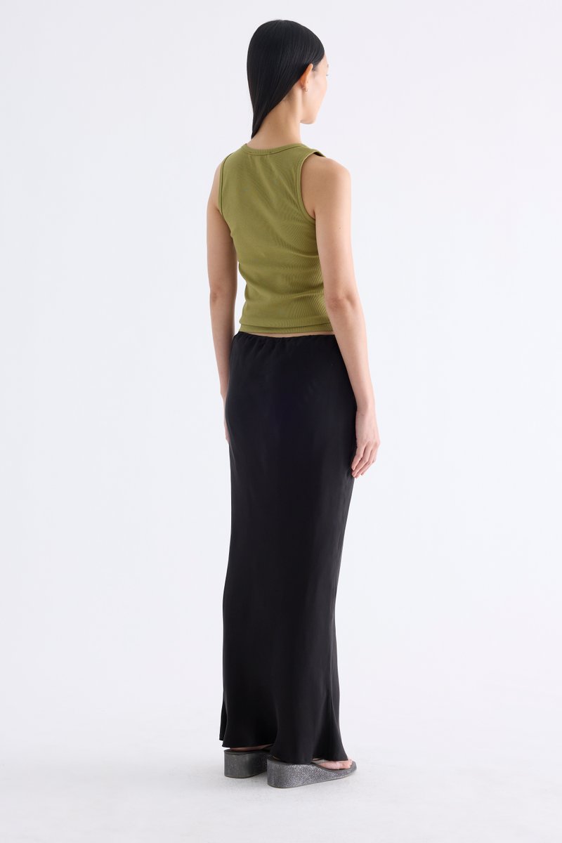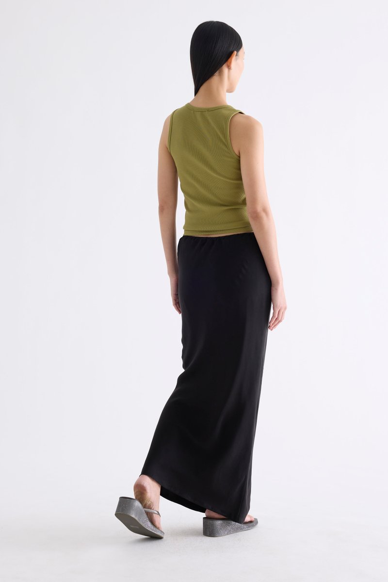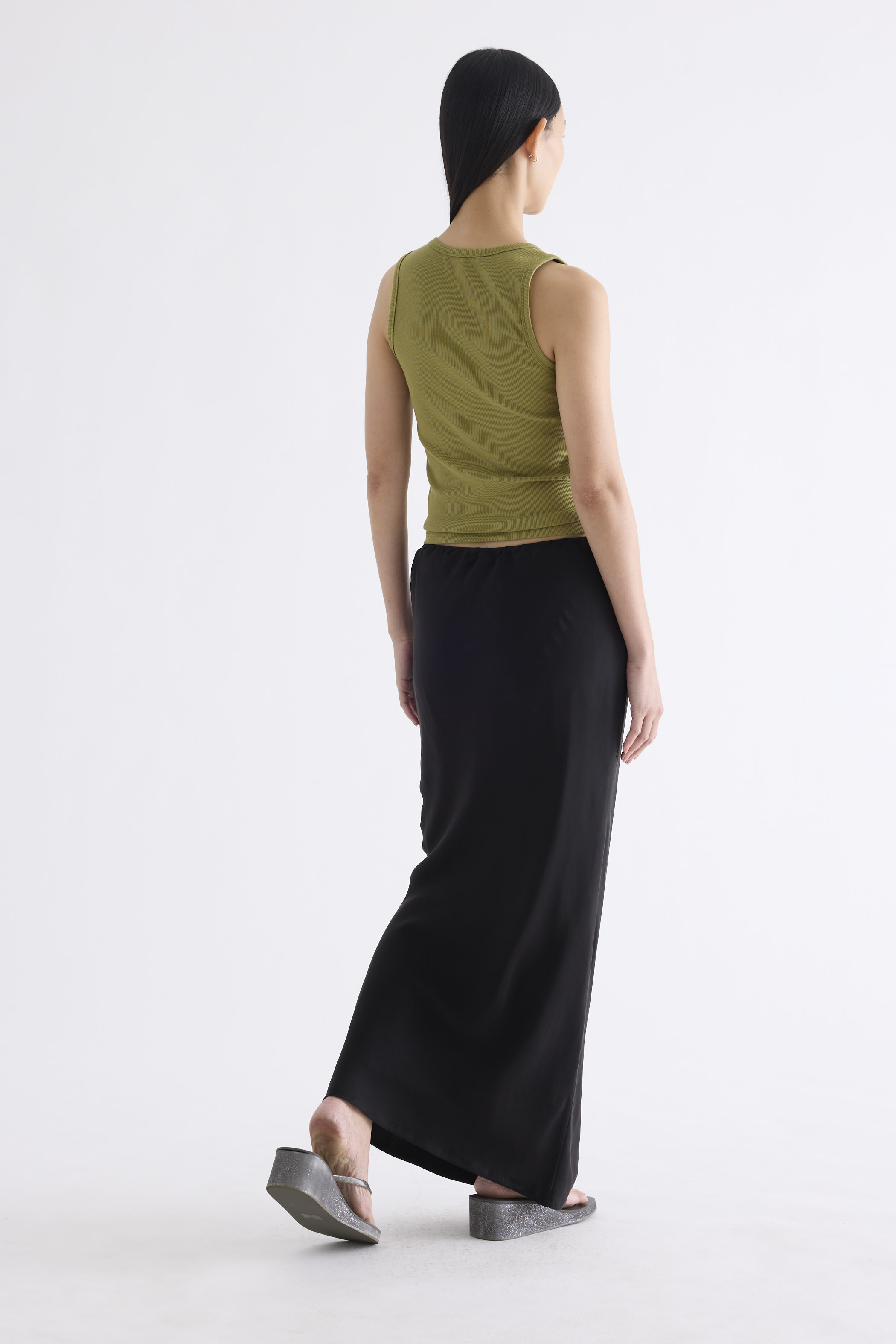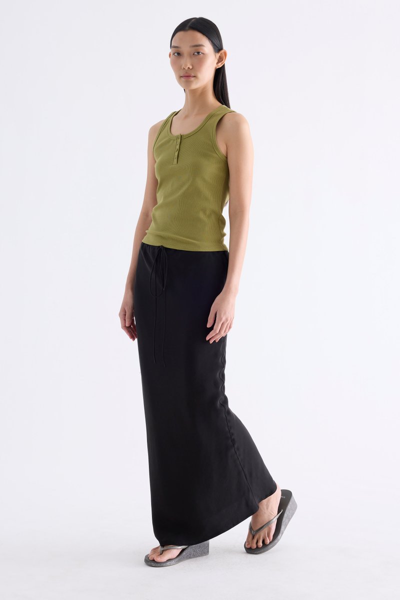 Fluid forms. Made from soft and smooth fabric, this maxi skirt features a bias-cut silhouette with an elasticated drawstring waistband. Worn in a slim fit.