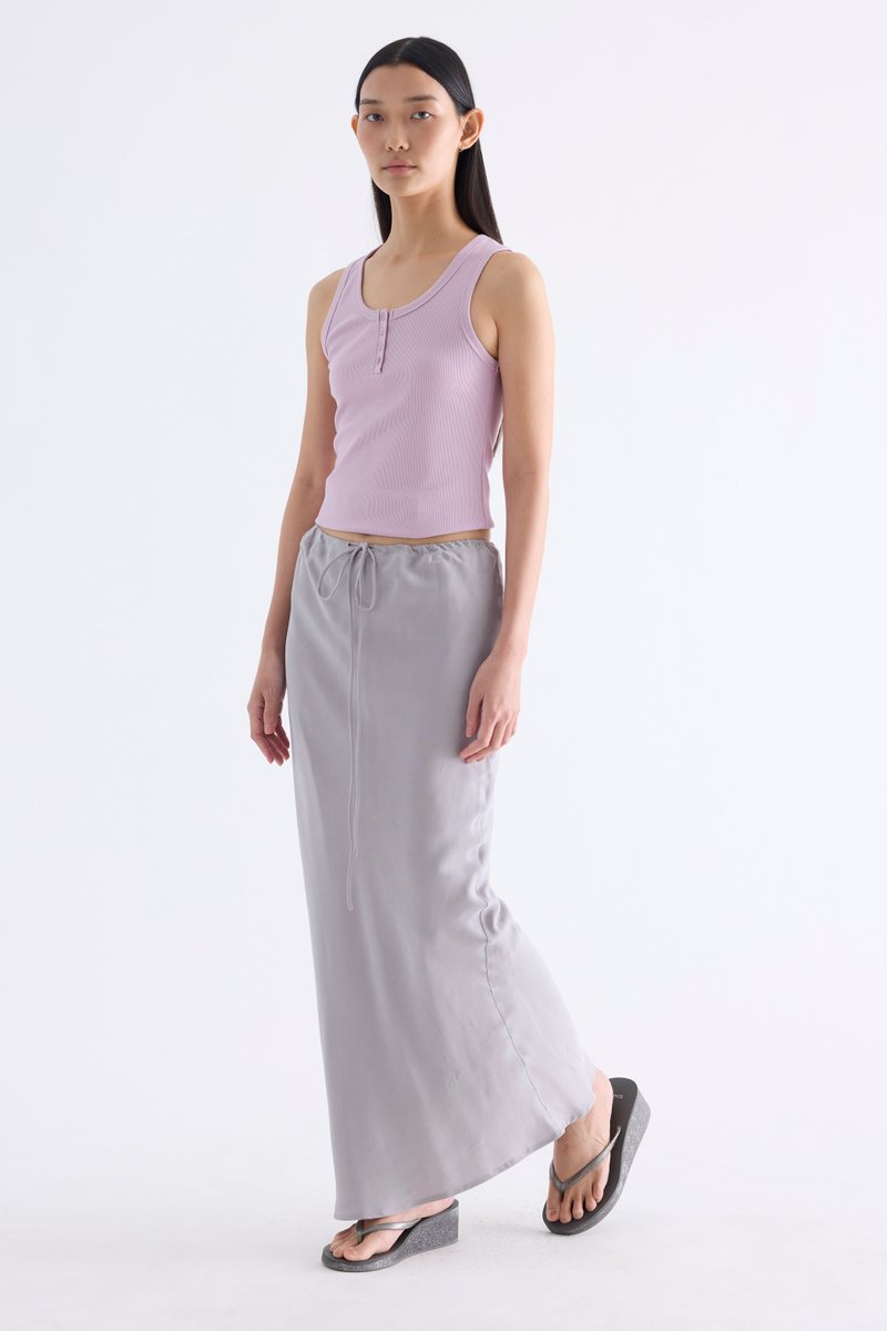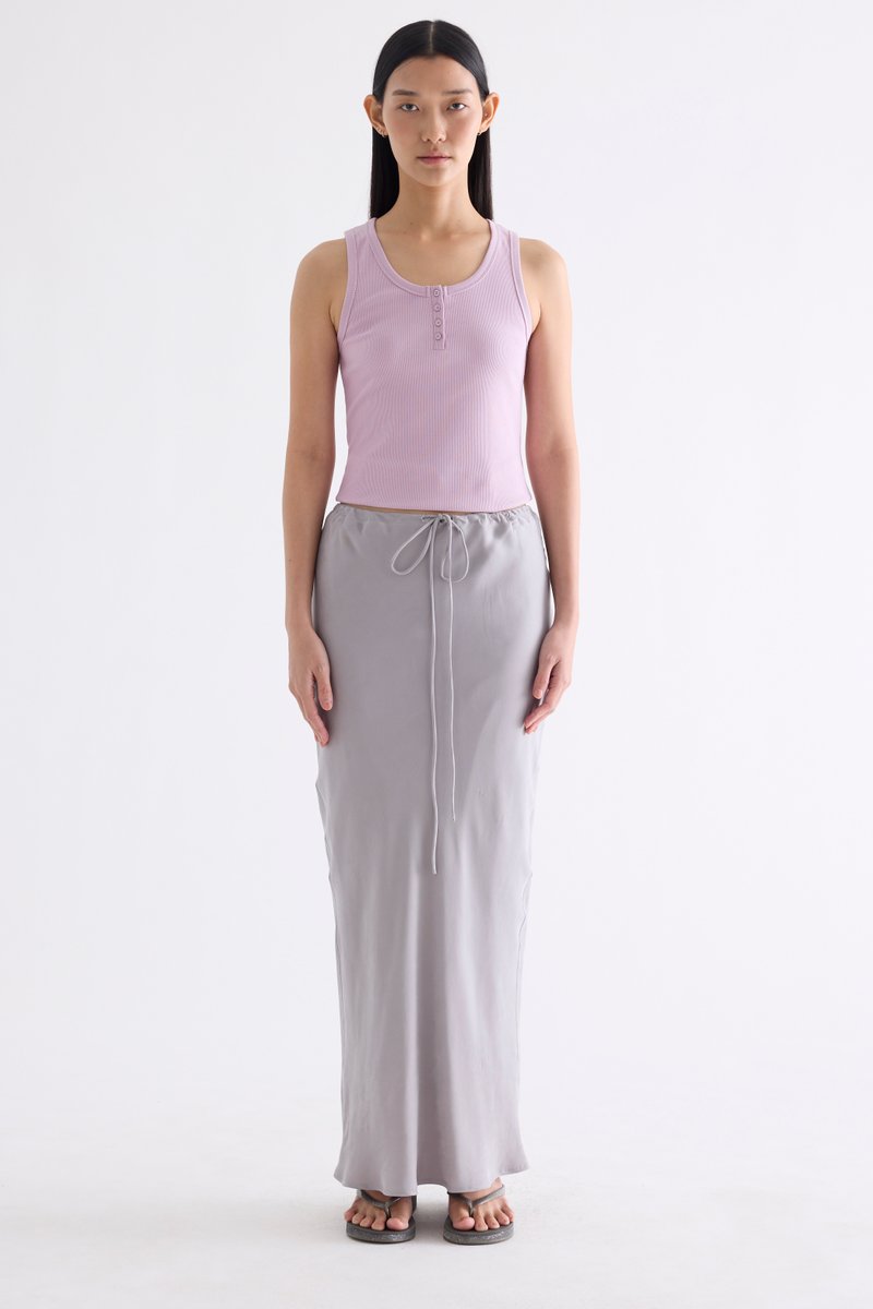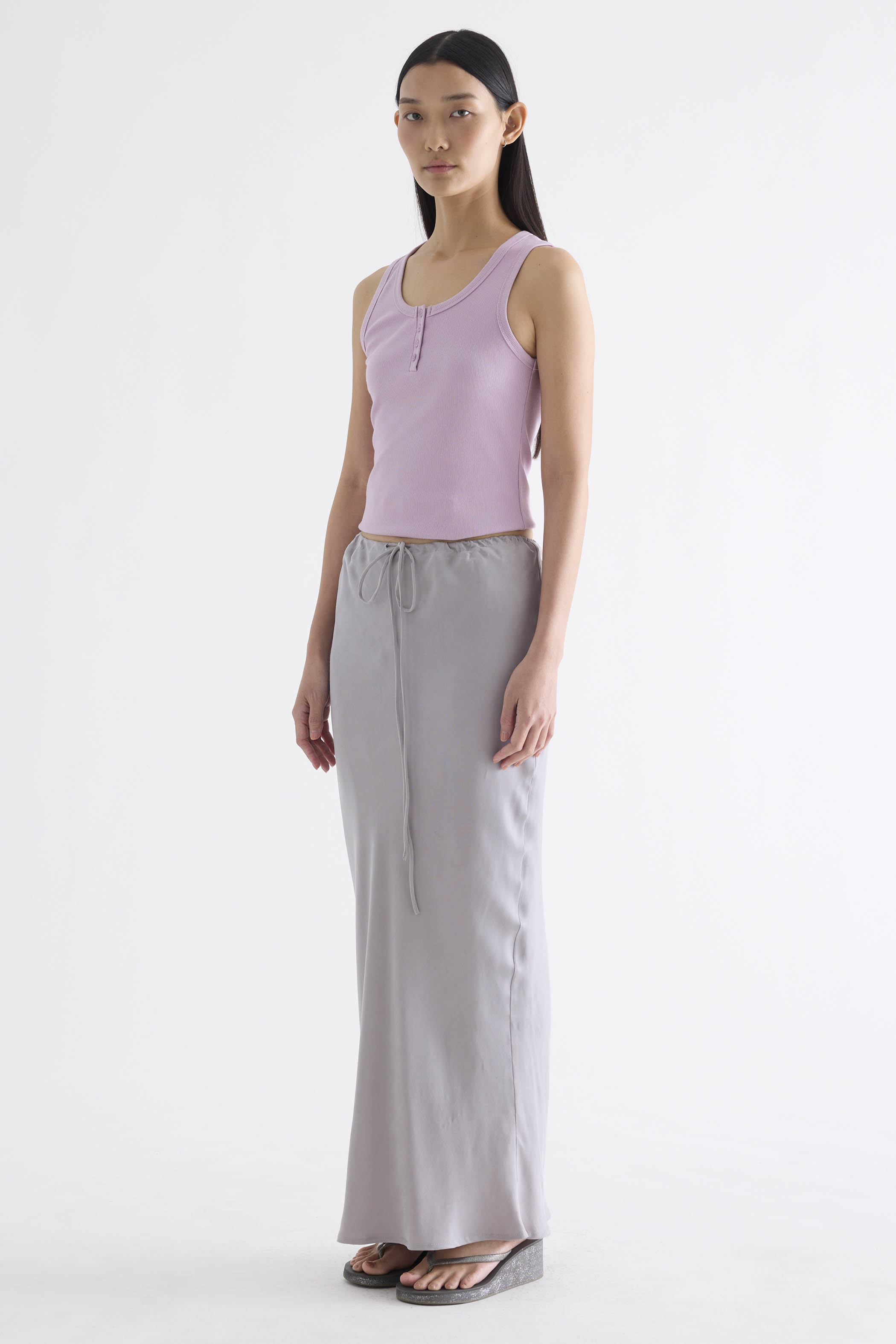 Fluid forms. Made from soft and smooth fabric, this maxi skirt features a bias-cut silhouette with an elasticated drawstring waistband. Worn in a slim fit.