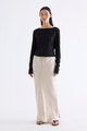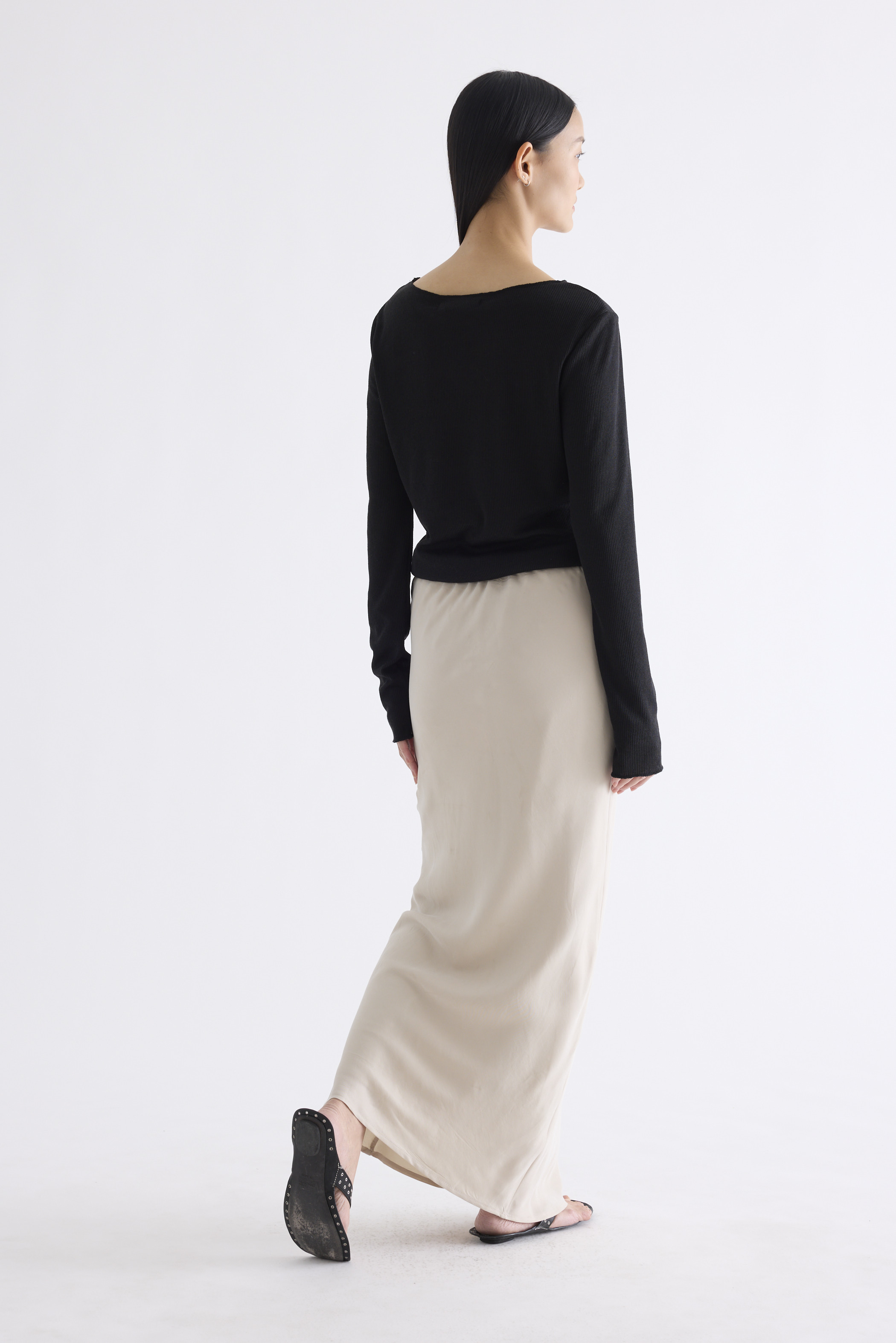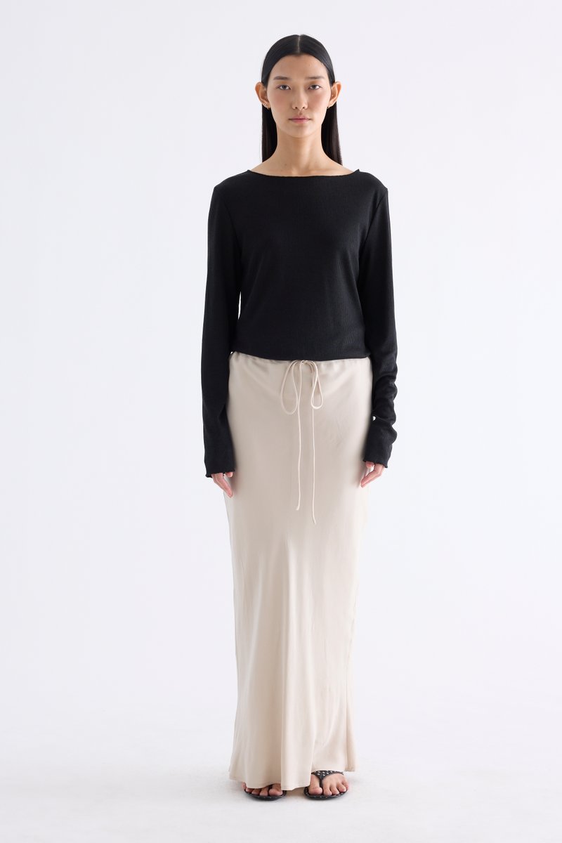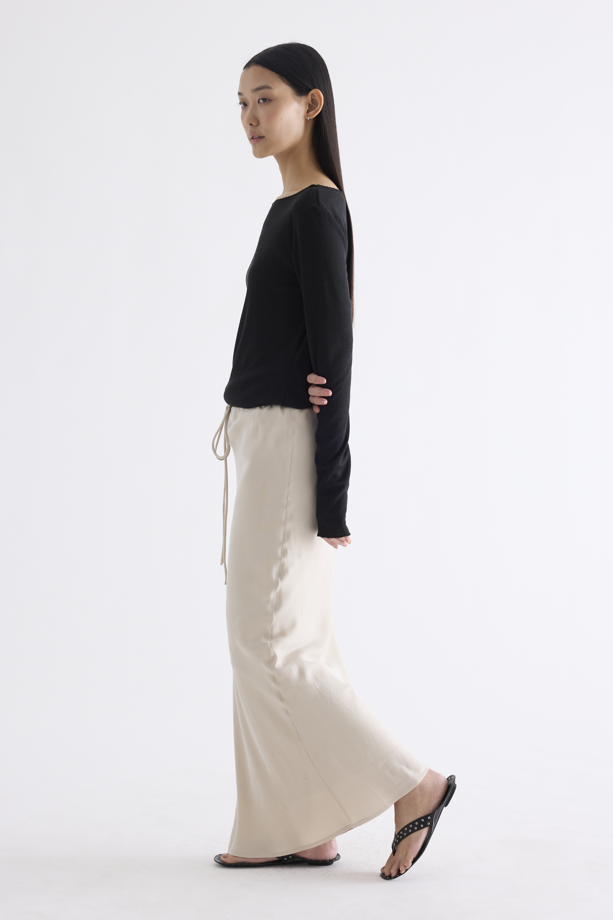 Fluid forms. Made from soft and smooth fabric, this maxi skirt features a bias-cut silhouette with an elasticated drawstring waistband. Worn in a slim fit.