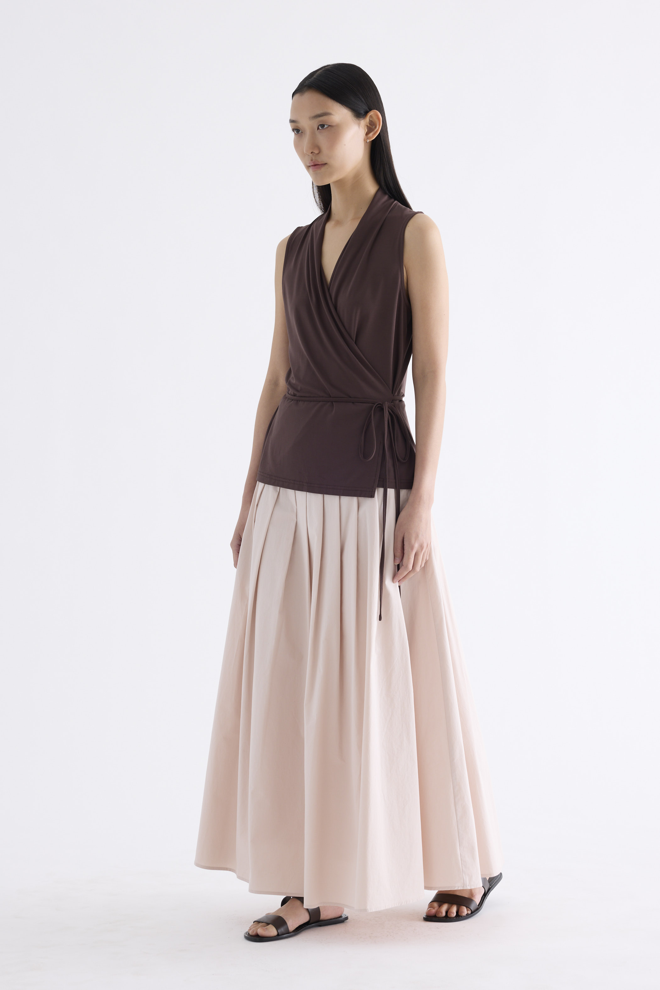 Fluid forms. Made from smooth and stretchy fabric, this sleeveless top features a wrapover neckline and waist tie-strap. Worn in a relaxed fit.